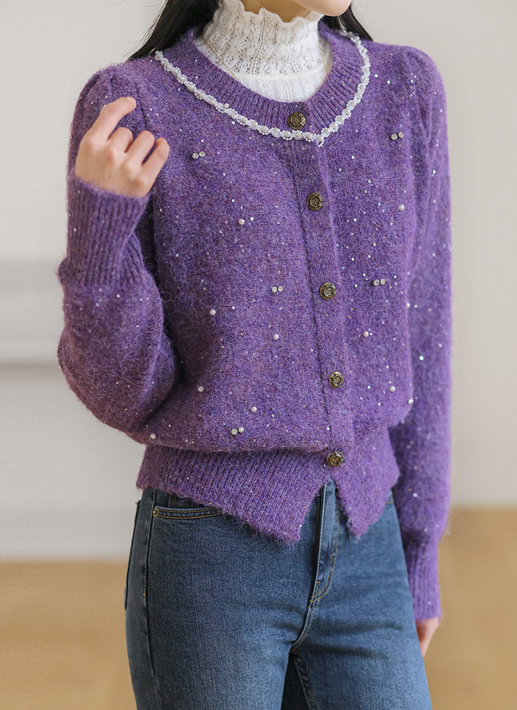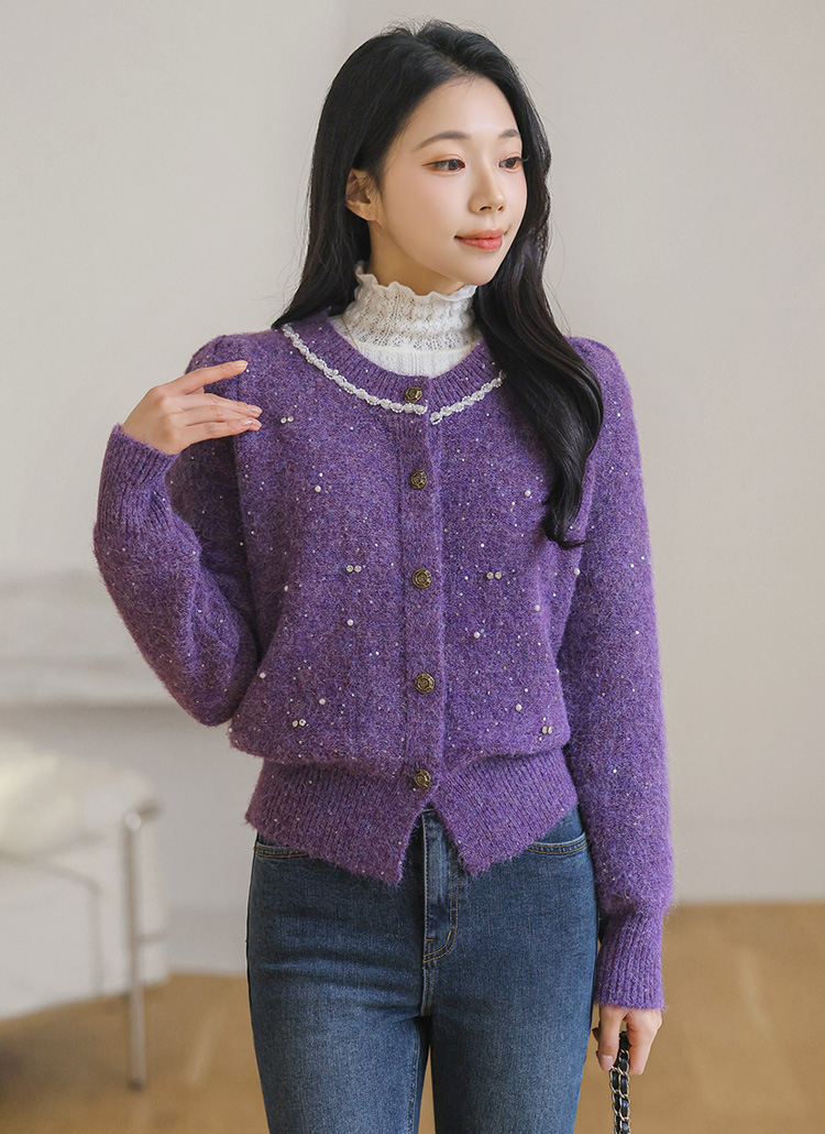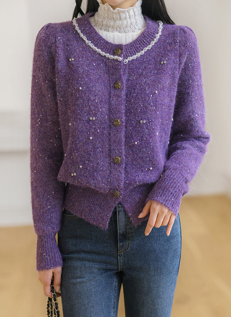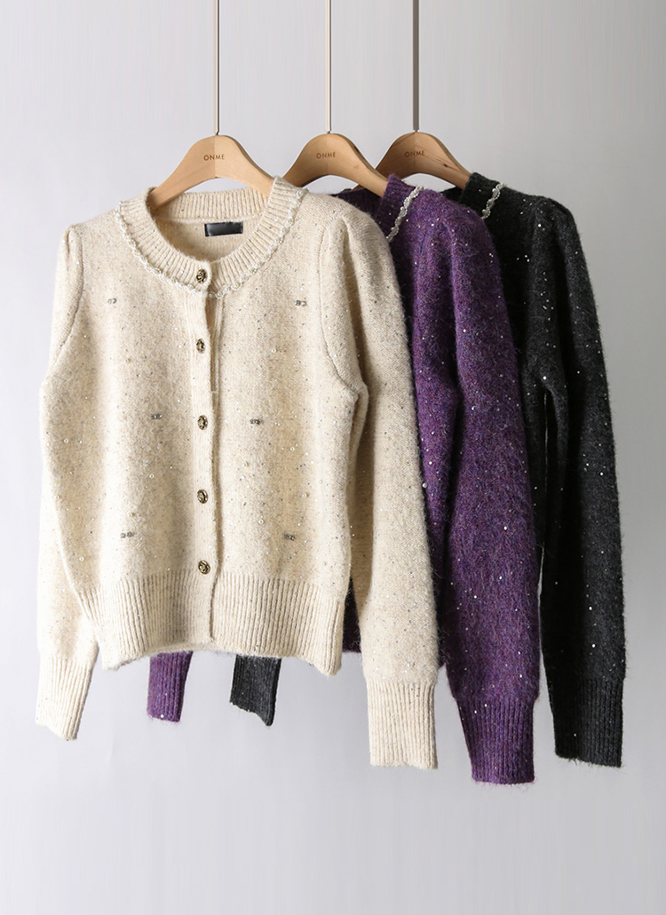 드웰 큐빅 스팽글 울 블렌딩 퍼프숄더 니트 가디건