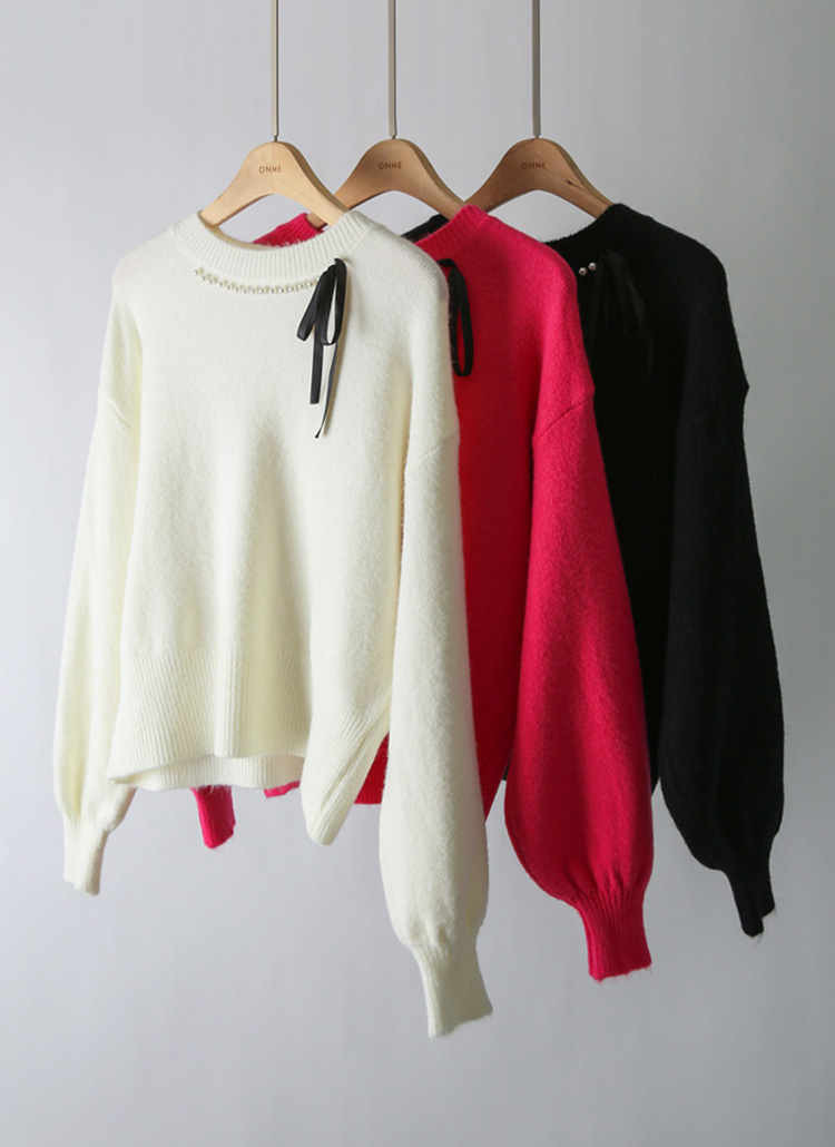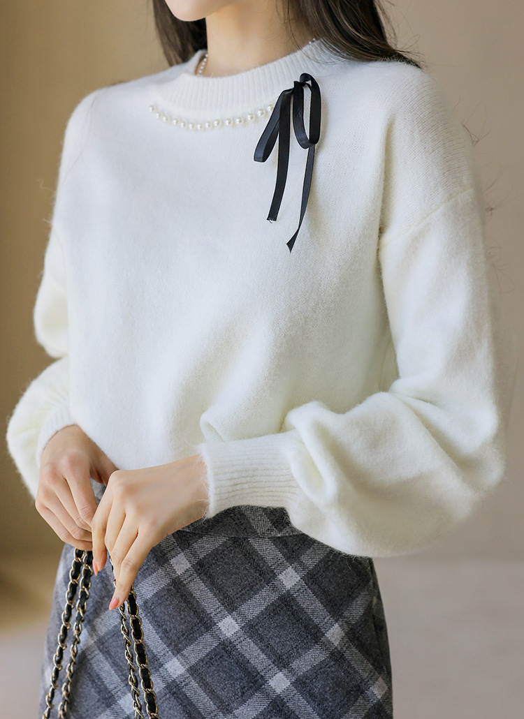 라미펄 진주 리본 포인트 포근 헤어리 퍼프 소매 니트