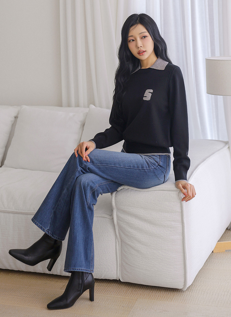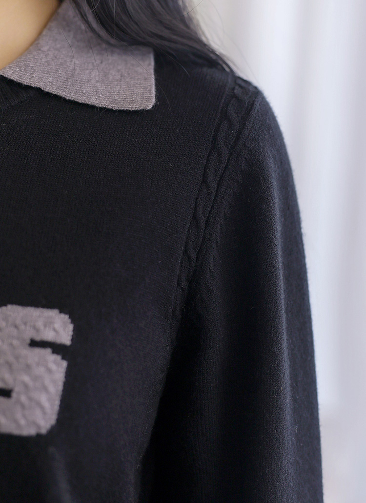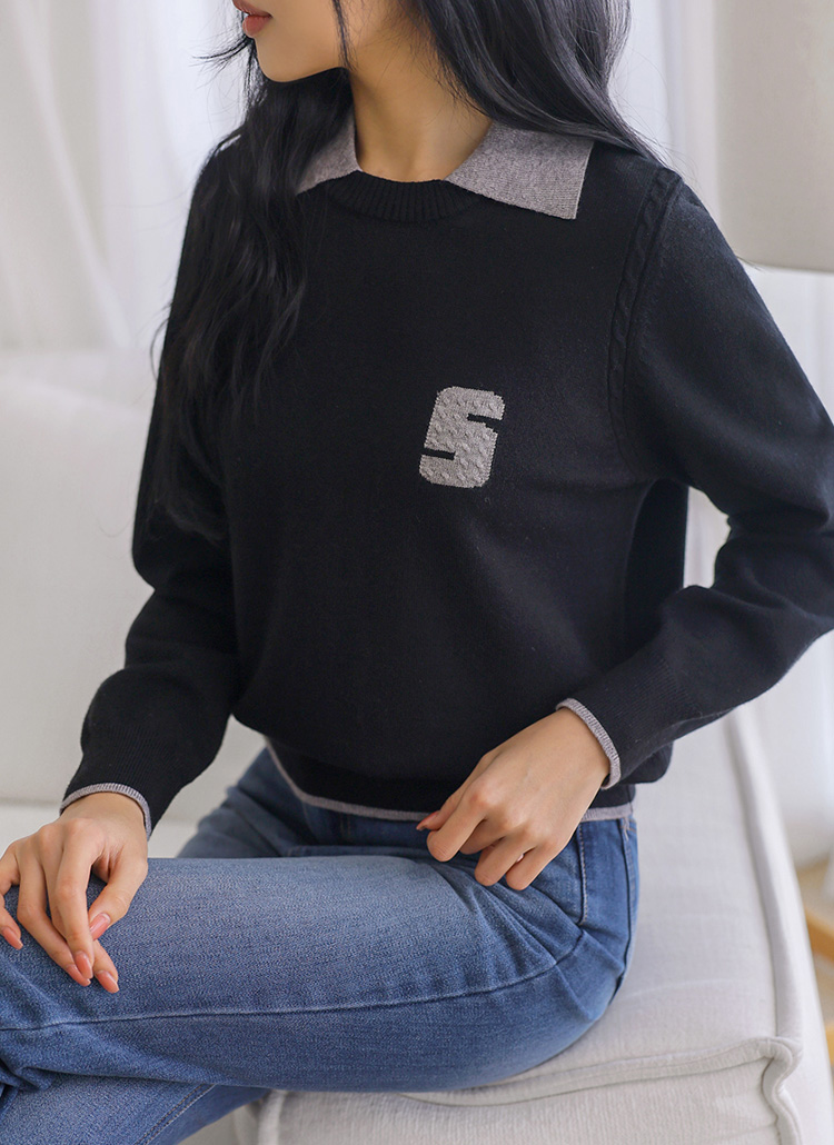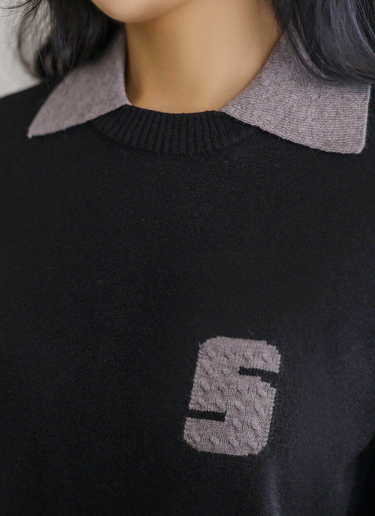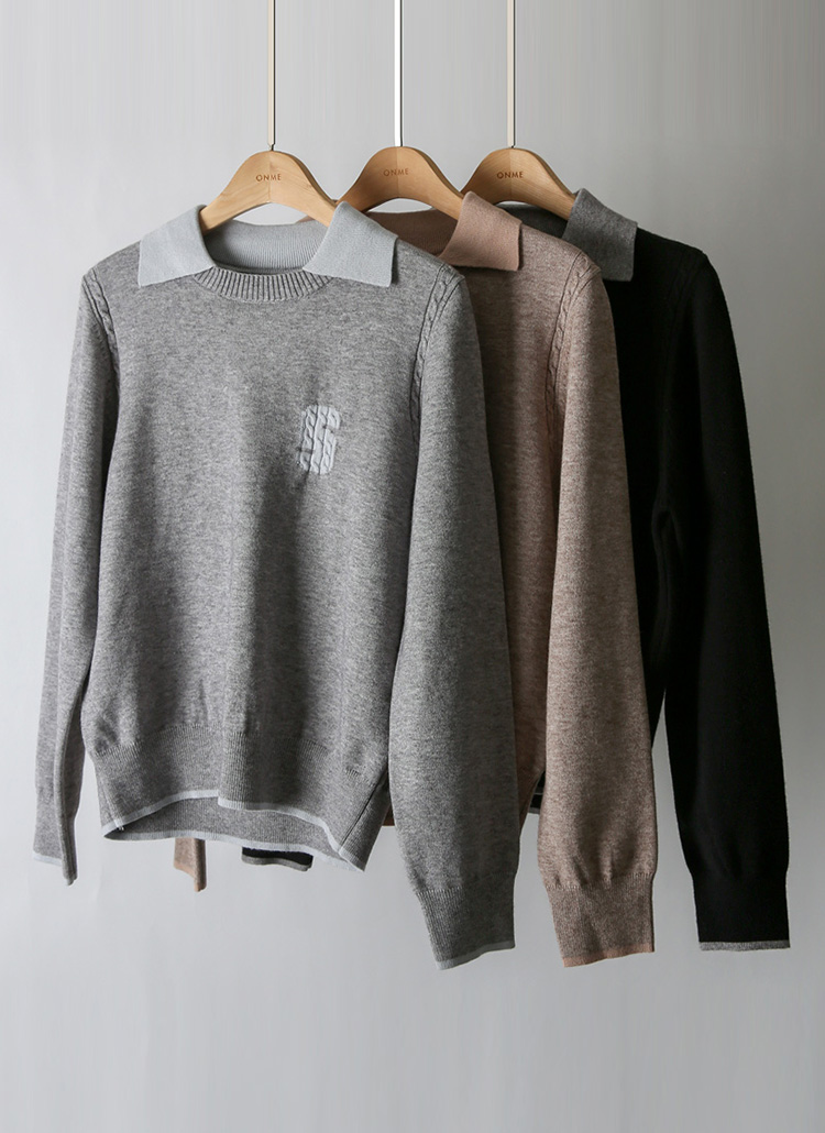 [Theonme] 엘핀 비스코스 배색 카라 레이어드 라운드 니트