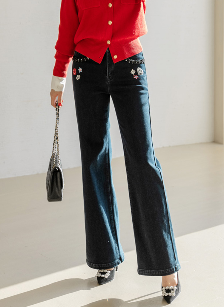 안나나 미니 스마일 와펜 체인 포인트 포근 기모 일자 세미 와이드 데님 팬츠