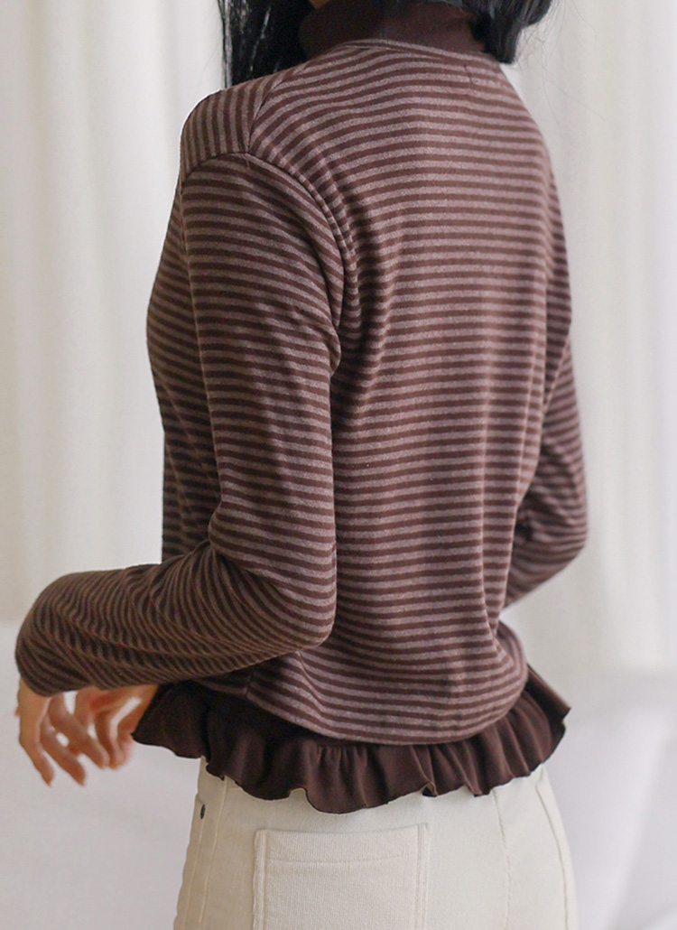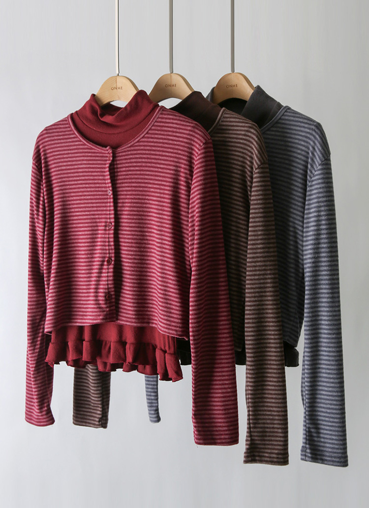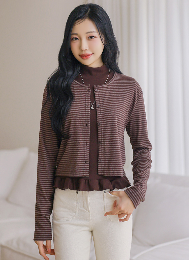 [Theonme] 에린드 프릴 레이어드 폴라 이너 스트라이프 가디건 세트