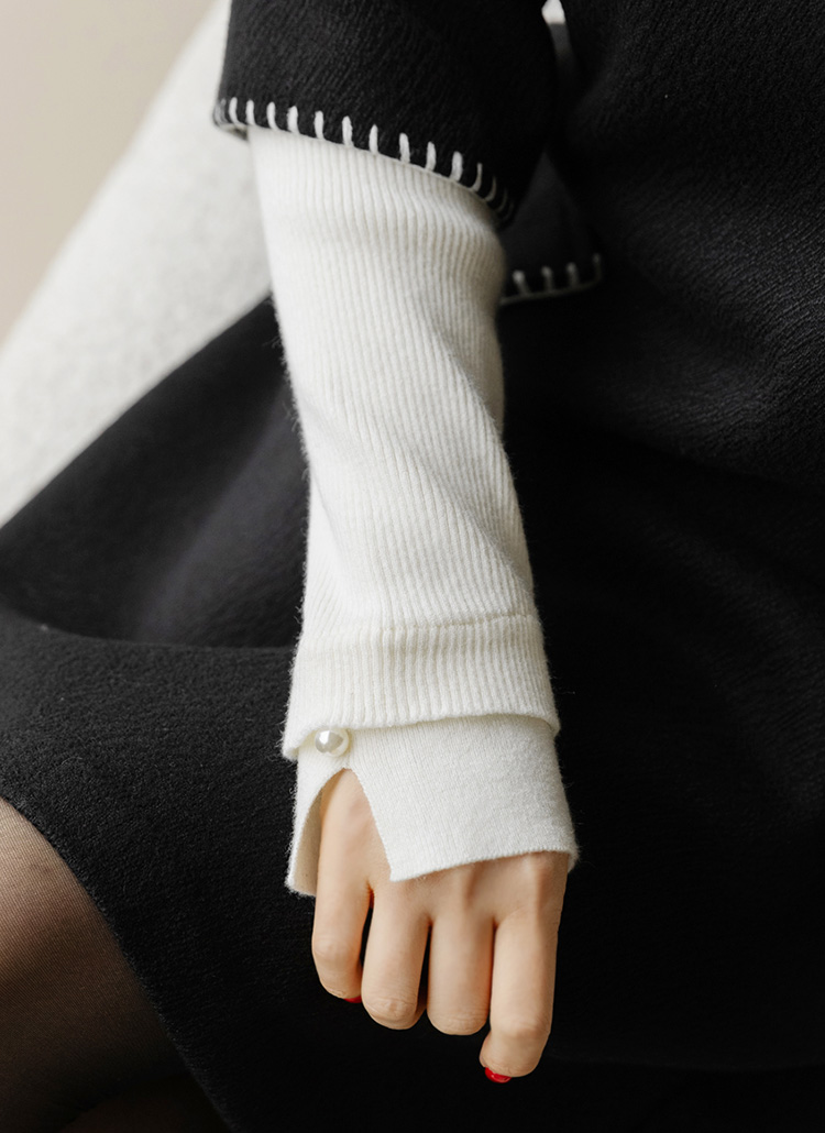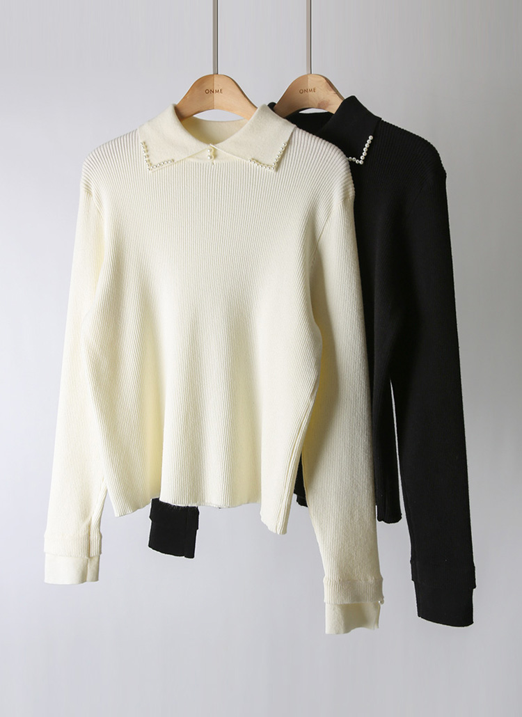 라오브 진주 포인트 소매 트임 카라 골지 니트