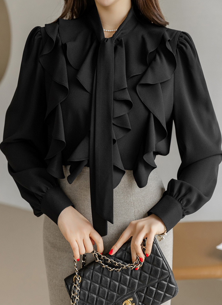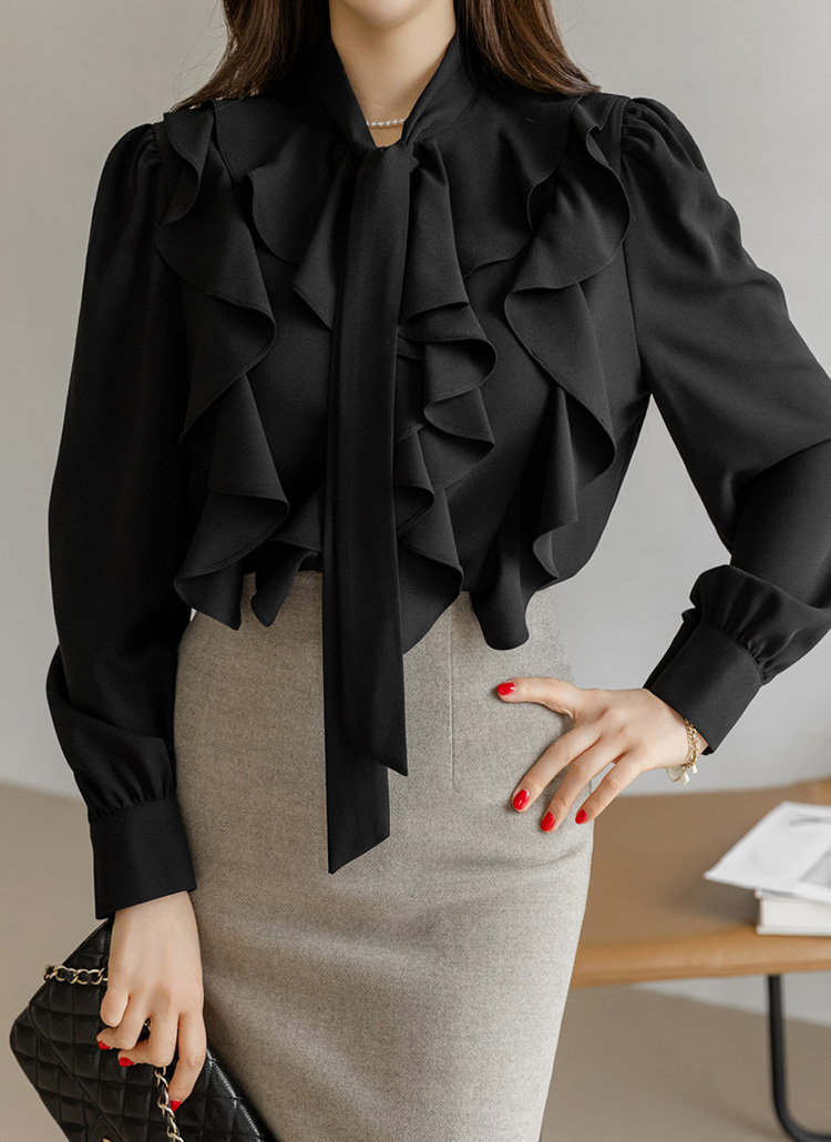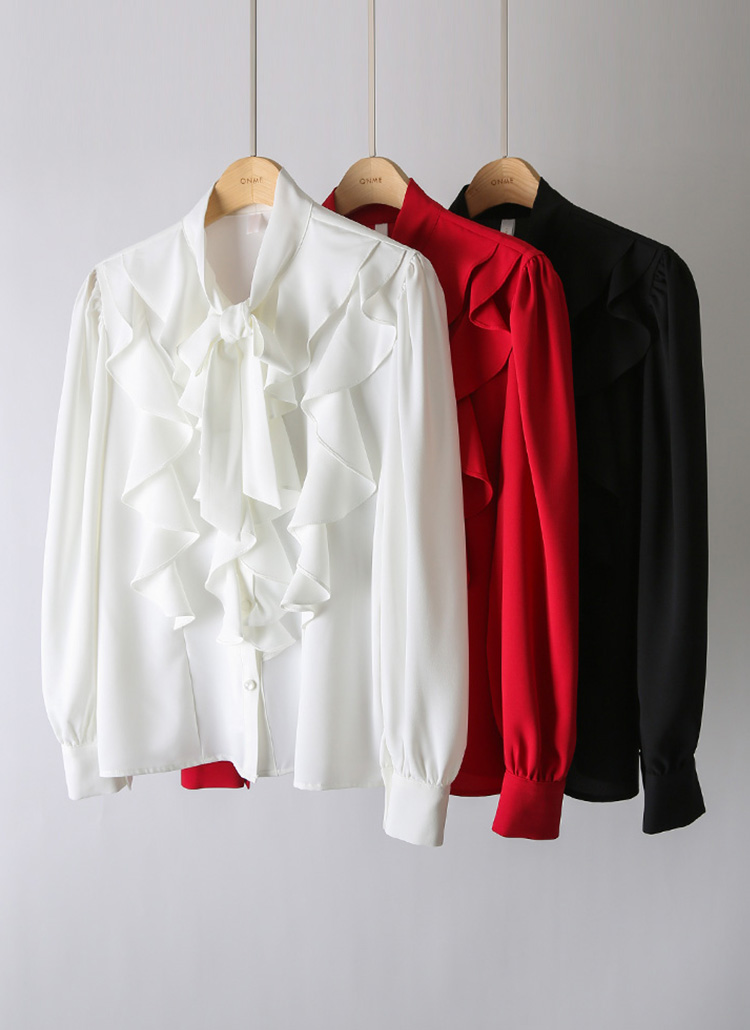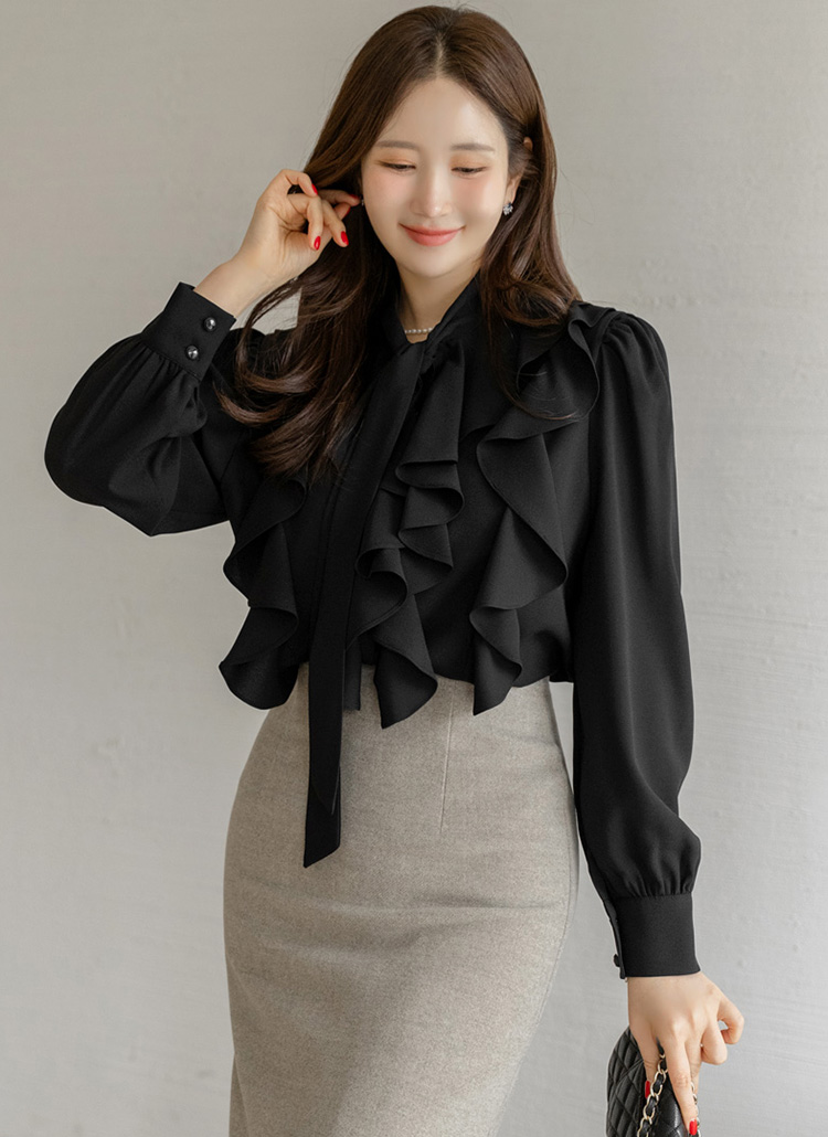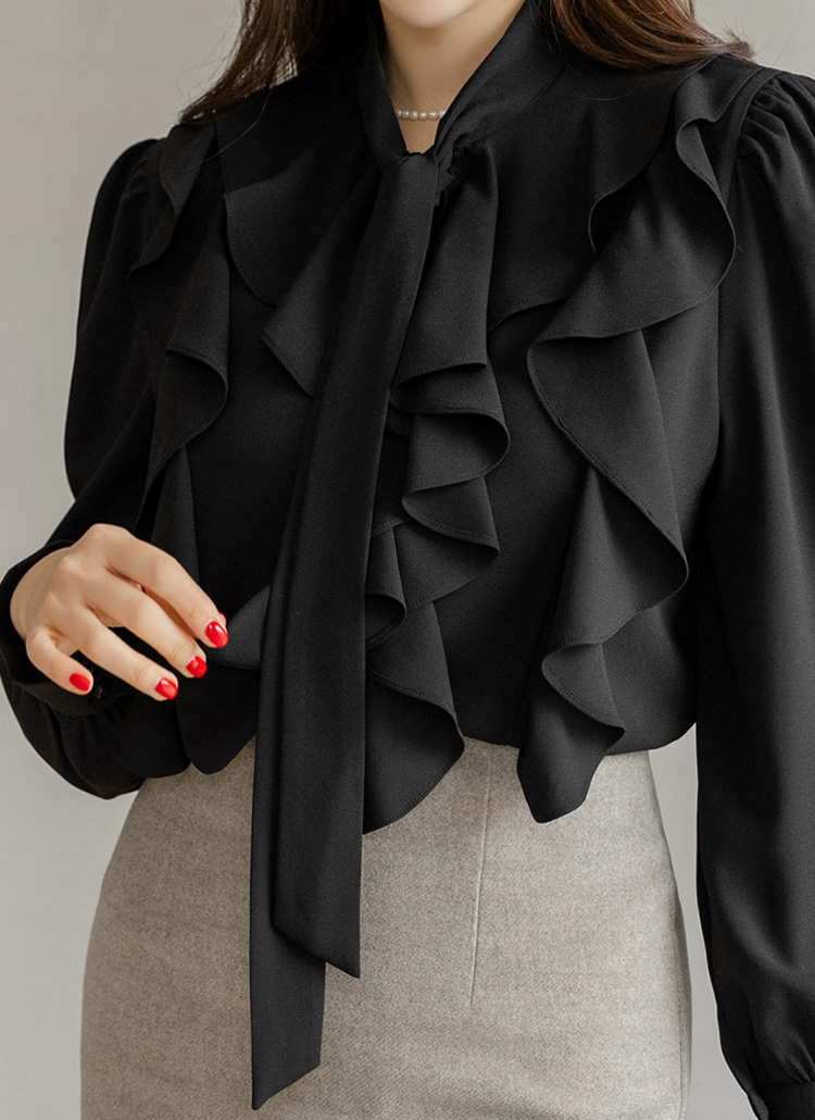 풍성하게 흐르는 러플 라인과 리본 타이 넥 디자인이 어우러져