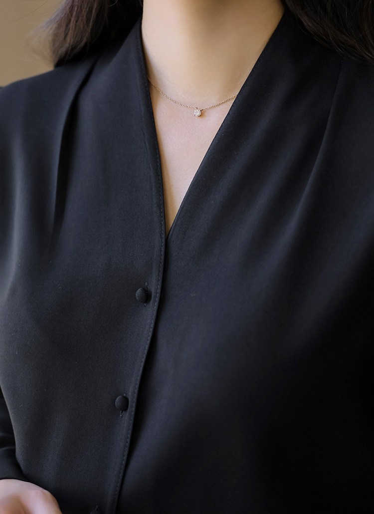 숄 디자인처럼 자연스럽게 떨어지는 브이넥 라인이