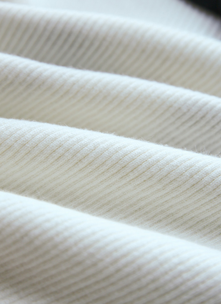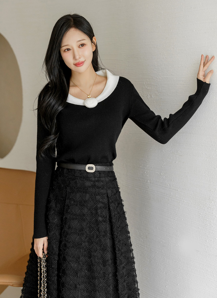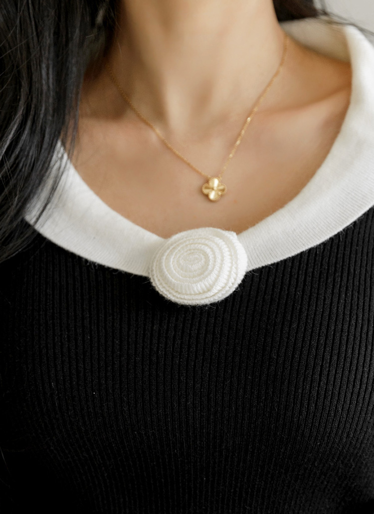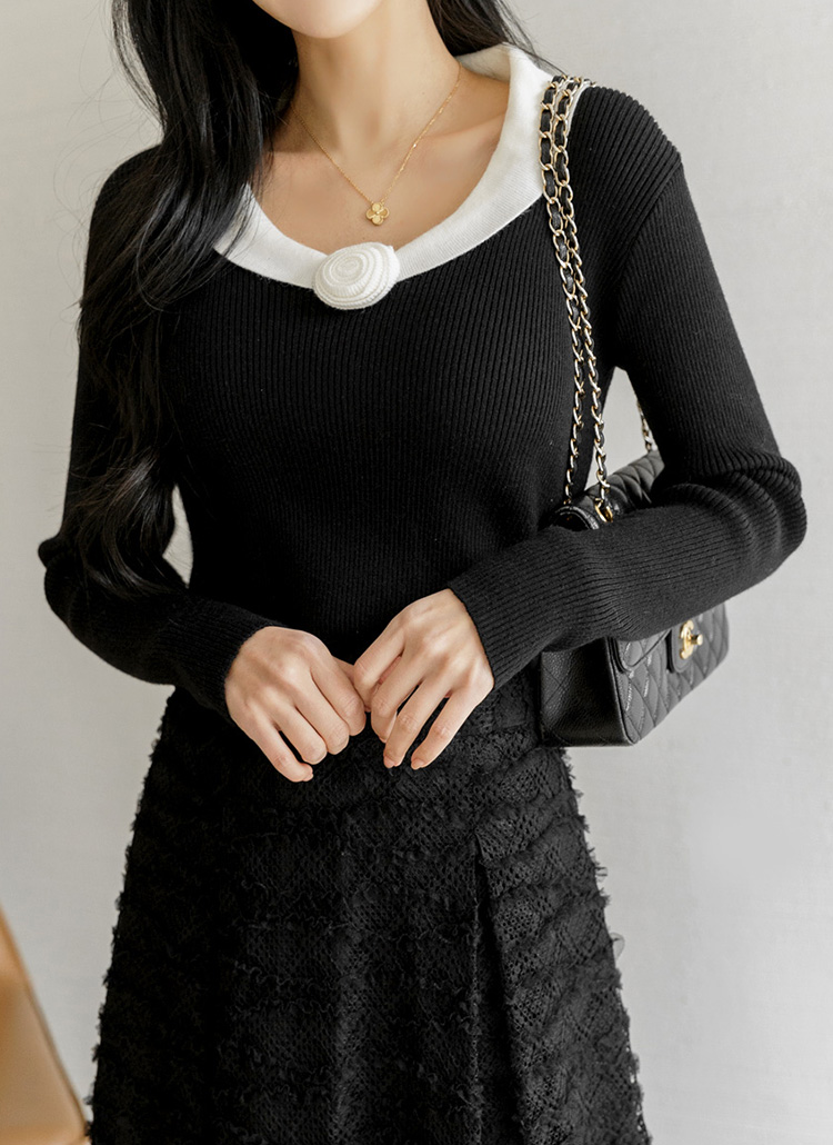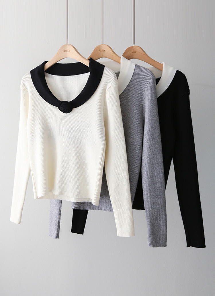 레모안 로즈 코사지 하프문 카라 배색 골지 니트