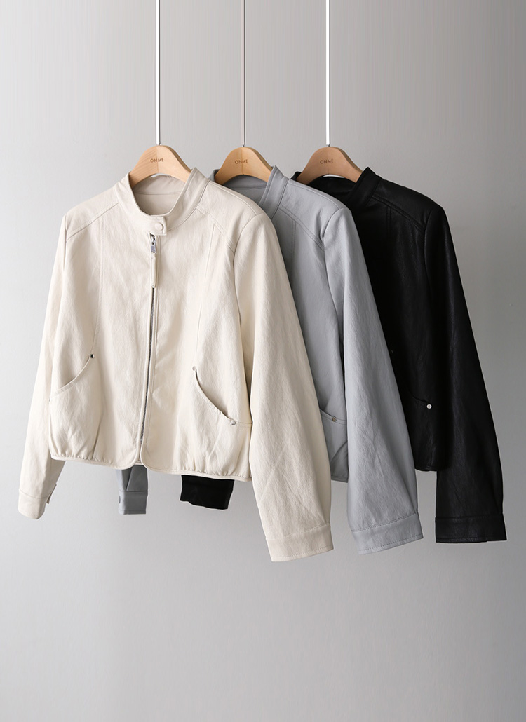 세렌느 소프트한 감촉 밑단 셔링 반하이넥 집업 레더 자켓