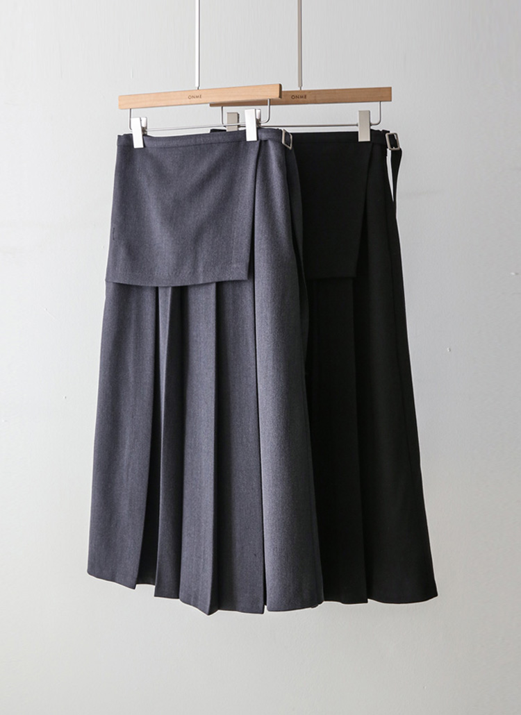 [Theonme] 디렐 랩 버클 레이어드 플리츠 롱 스커트