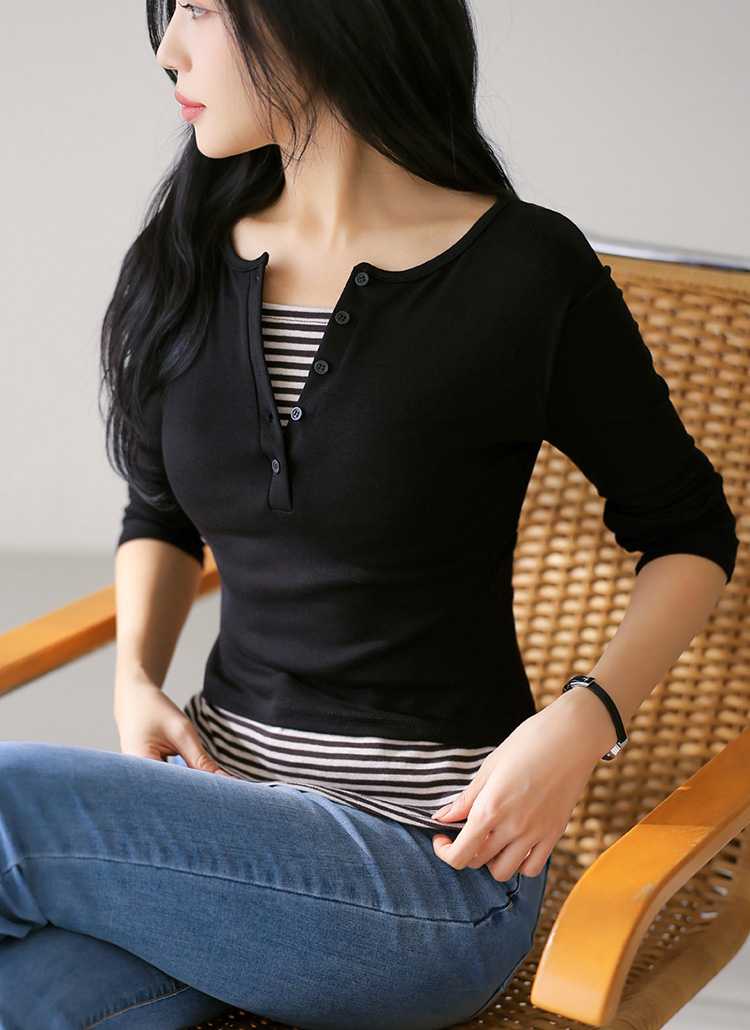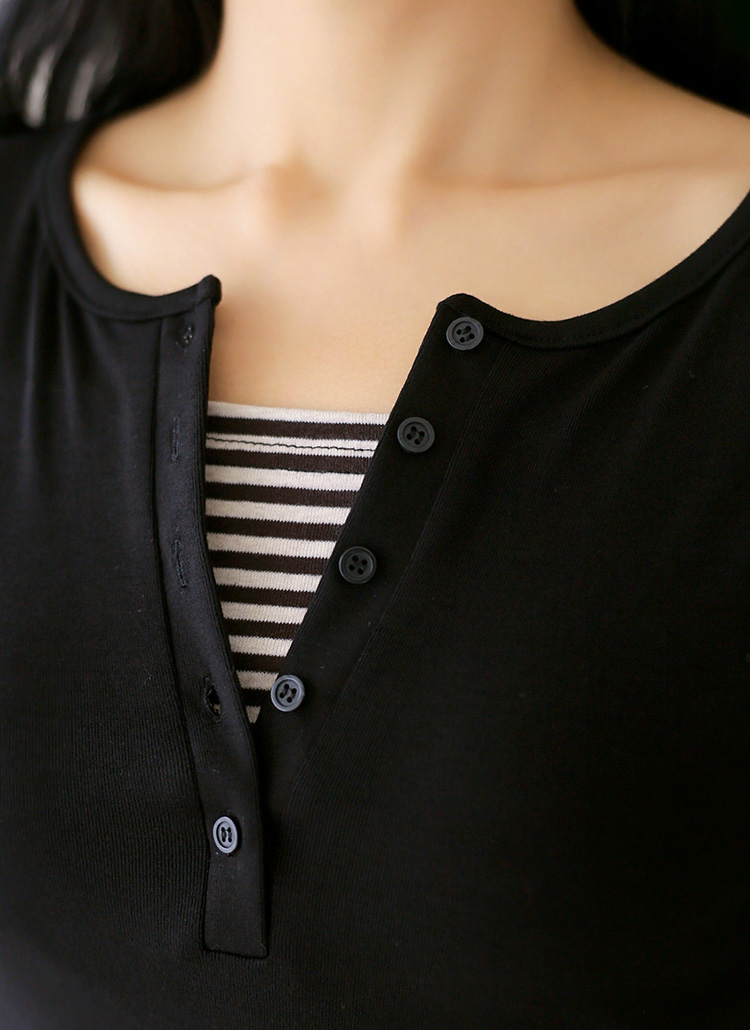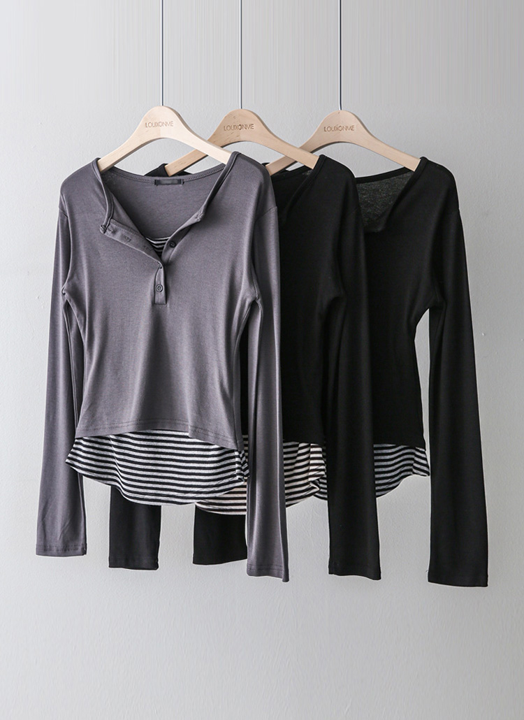 [Theonme] 데인트 스트라이프 레이어드 헨리넥 티셔츠