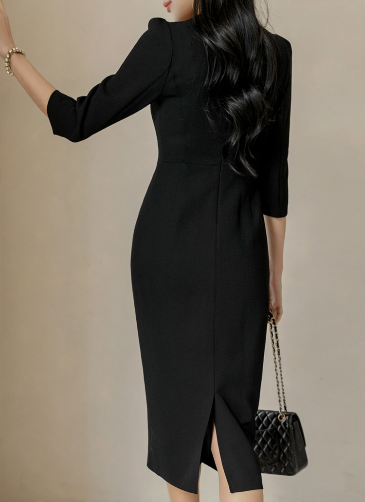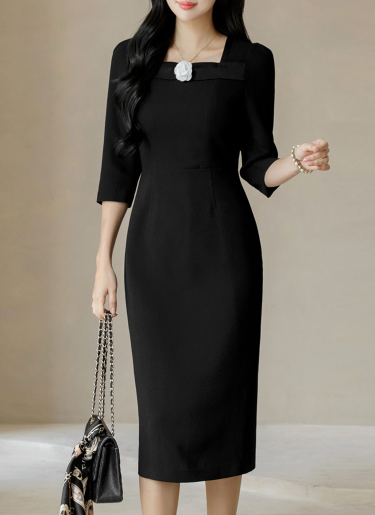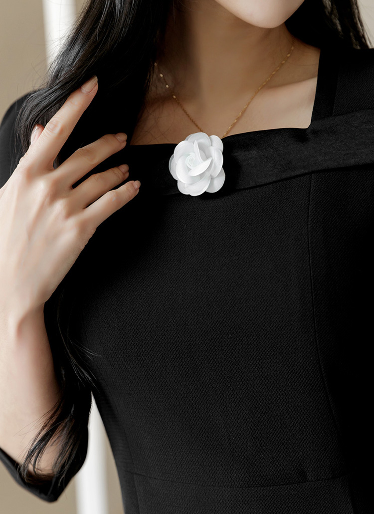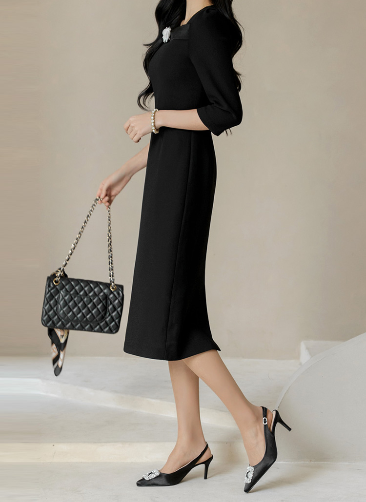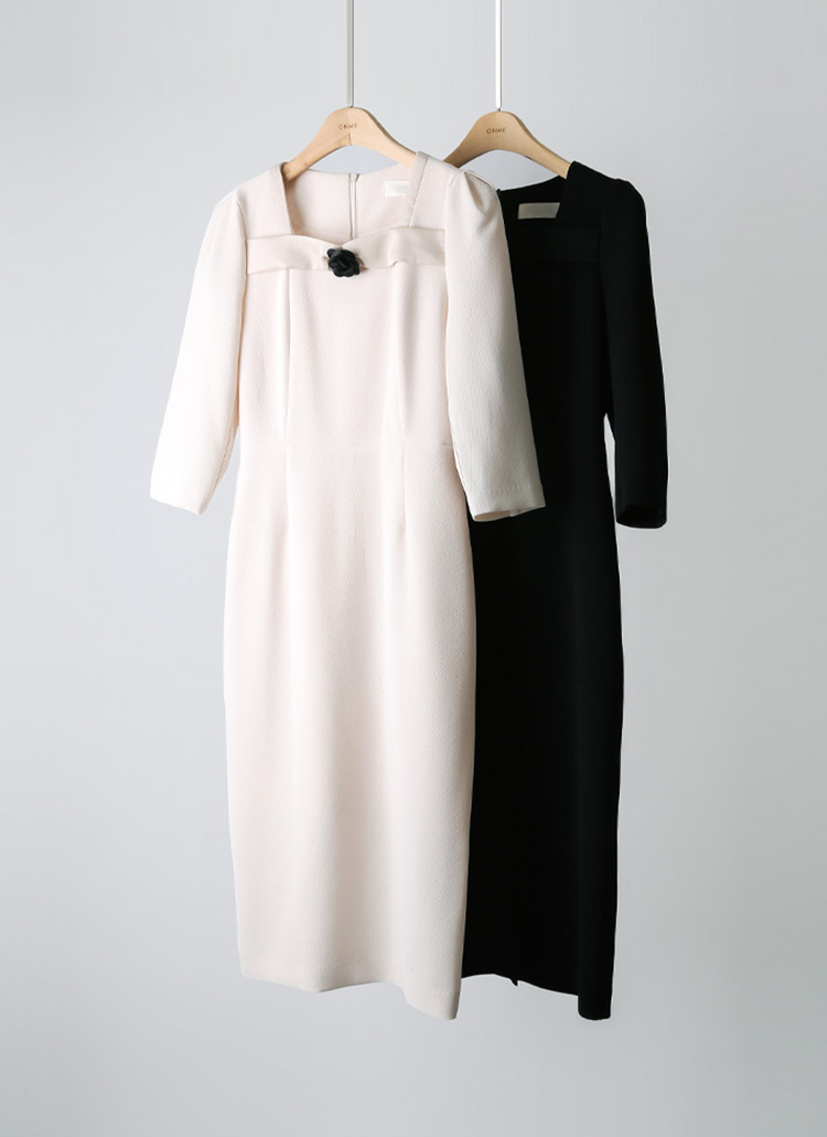 렌디아 로즈 코사지 SET 스퀘어넥 완벽 슬림 라인 롱 원피스