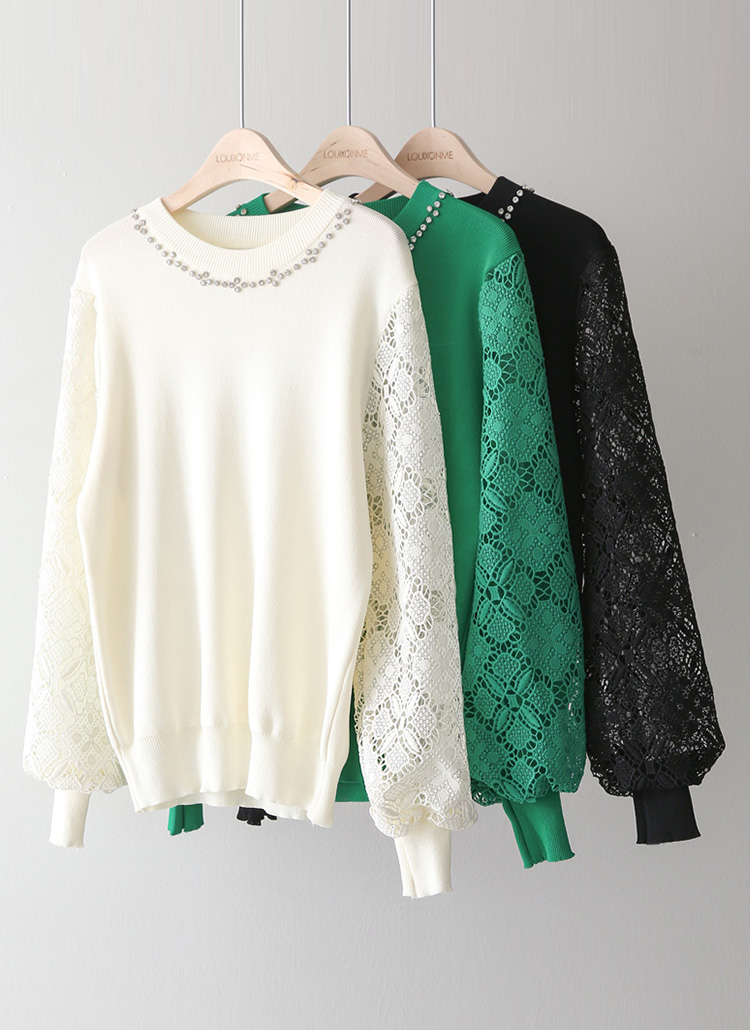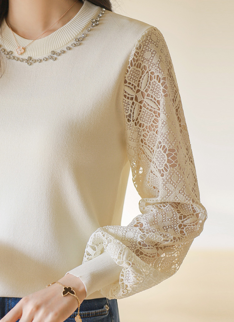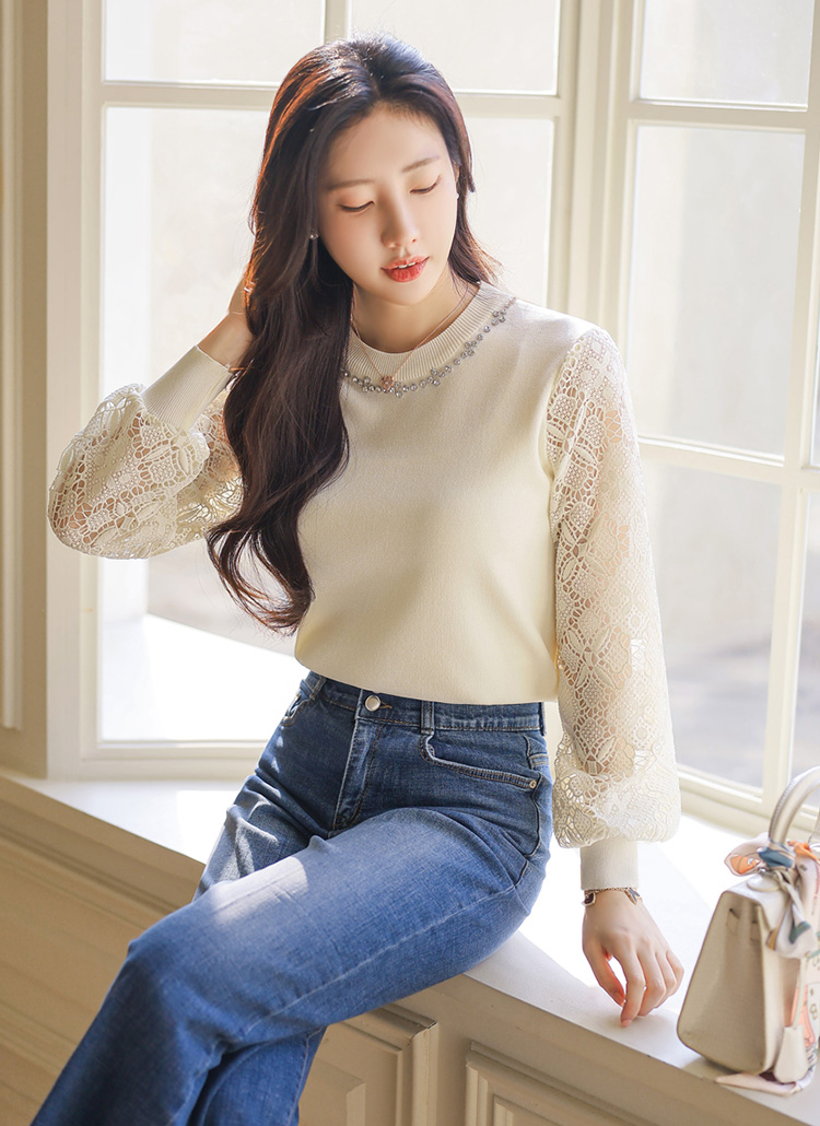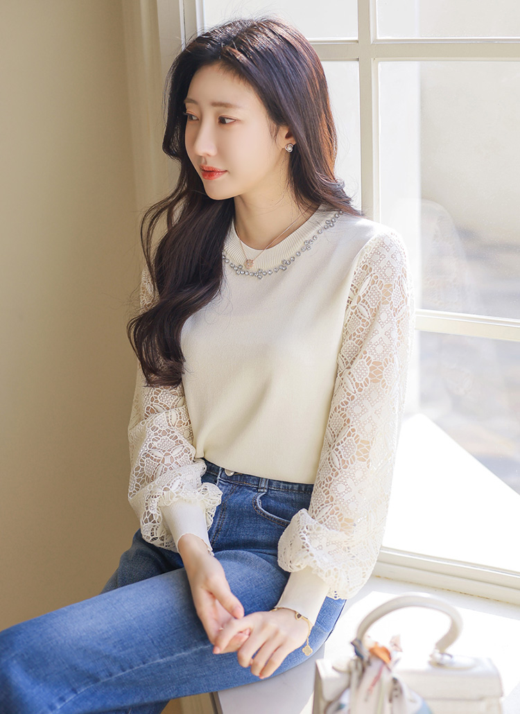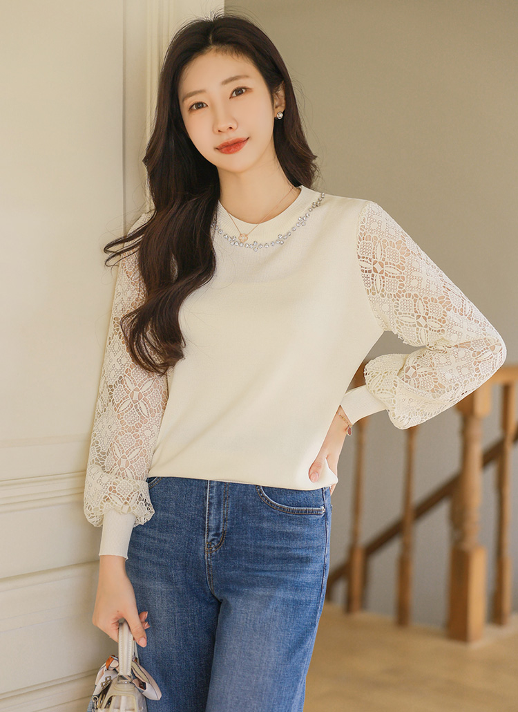 젠디아 소매 이중 레이스 배색 쥬얼 넥 니트 블라우스