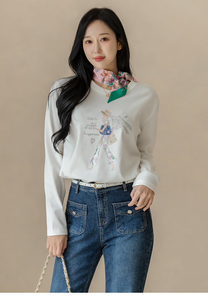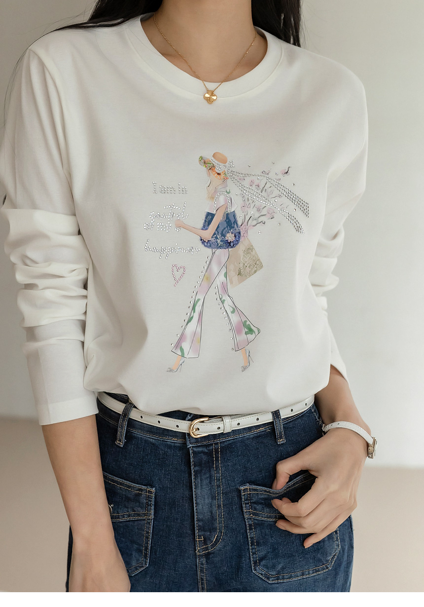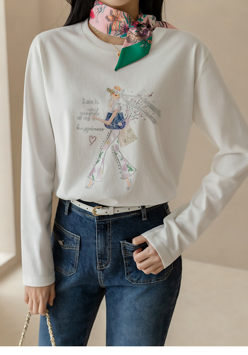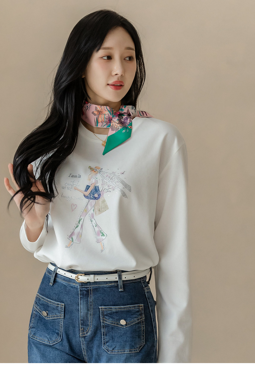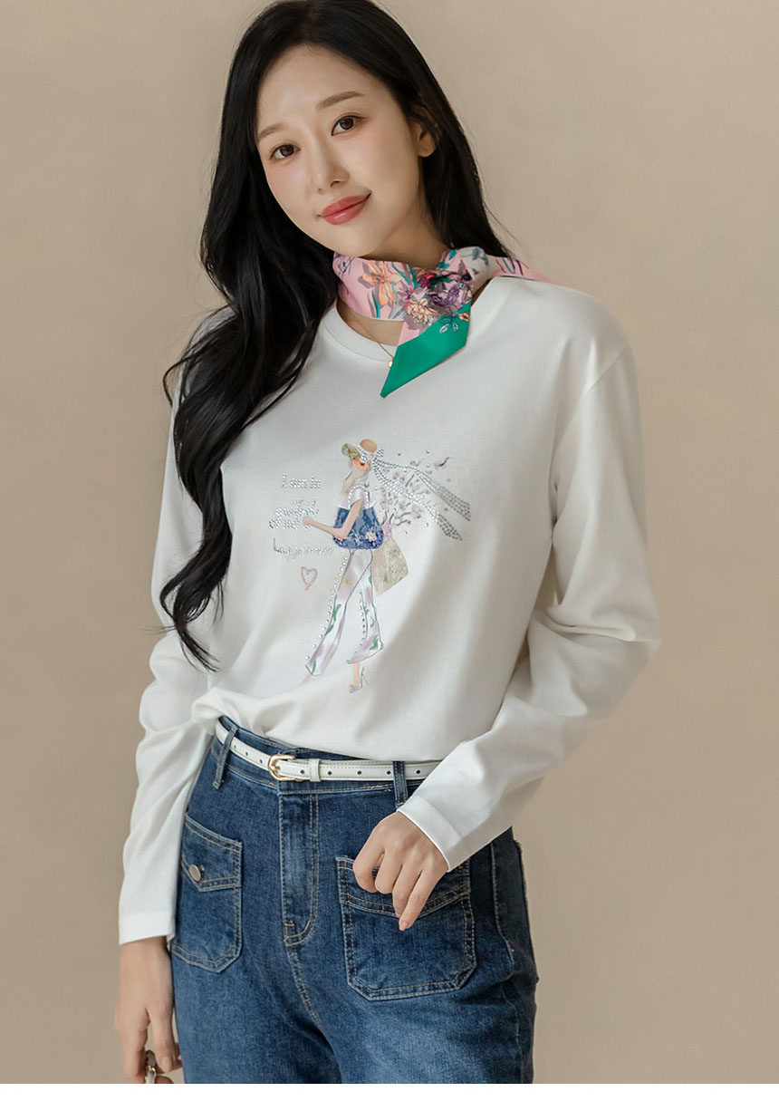 [LouisAngel] 에나린 스프링 걸 핫픽스 드로잉 프린팅 라운드 긴팔 티셔츠