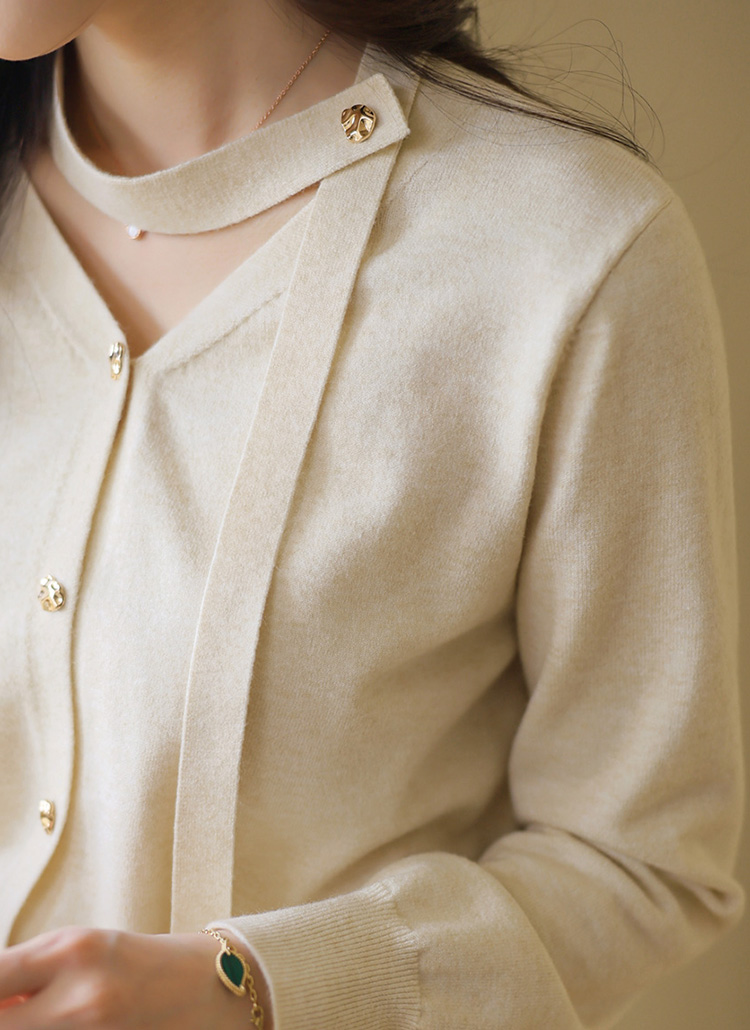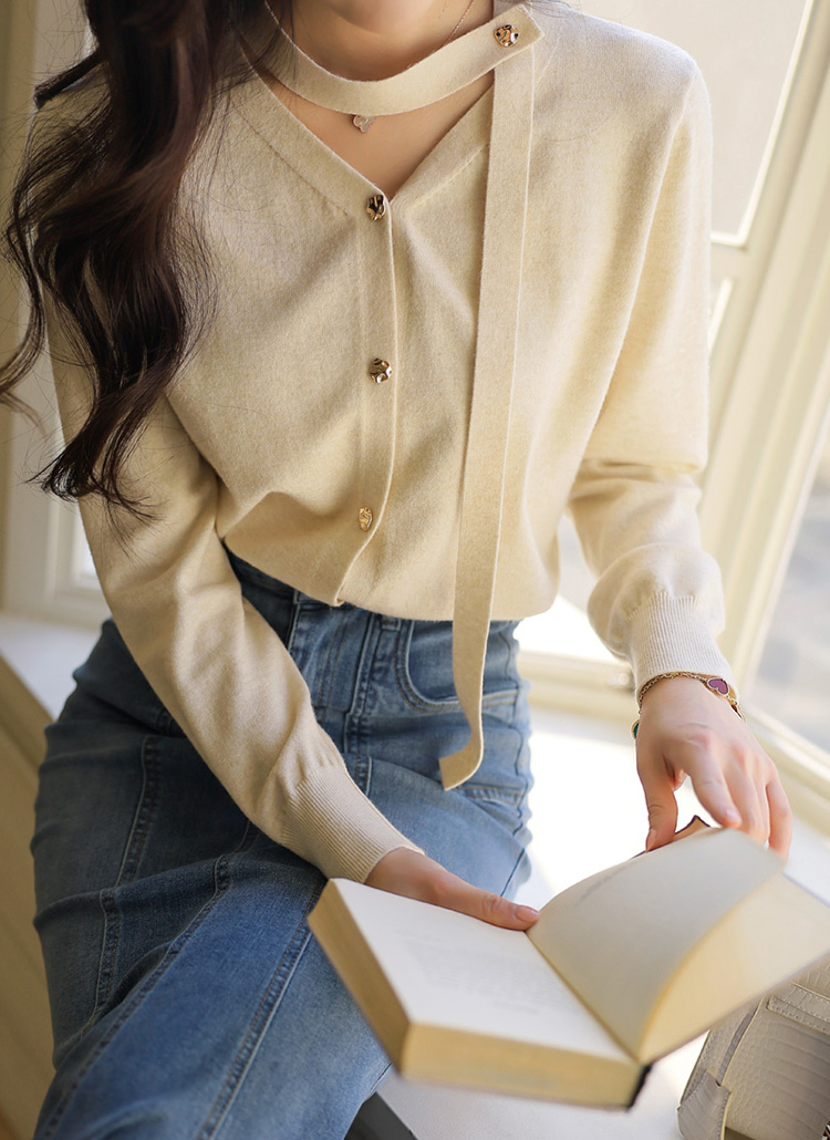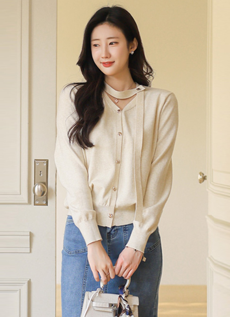 리오엔 리본 넥 디자인 골드 버튼 브이넥 니트 가디건