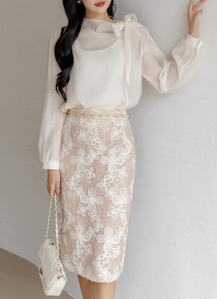 [LouisAngel] 테리지 모티브 쟈가드 플라워 레이어드 레이스 H라인 펜슬 미디 스커트
