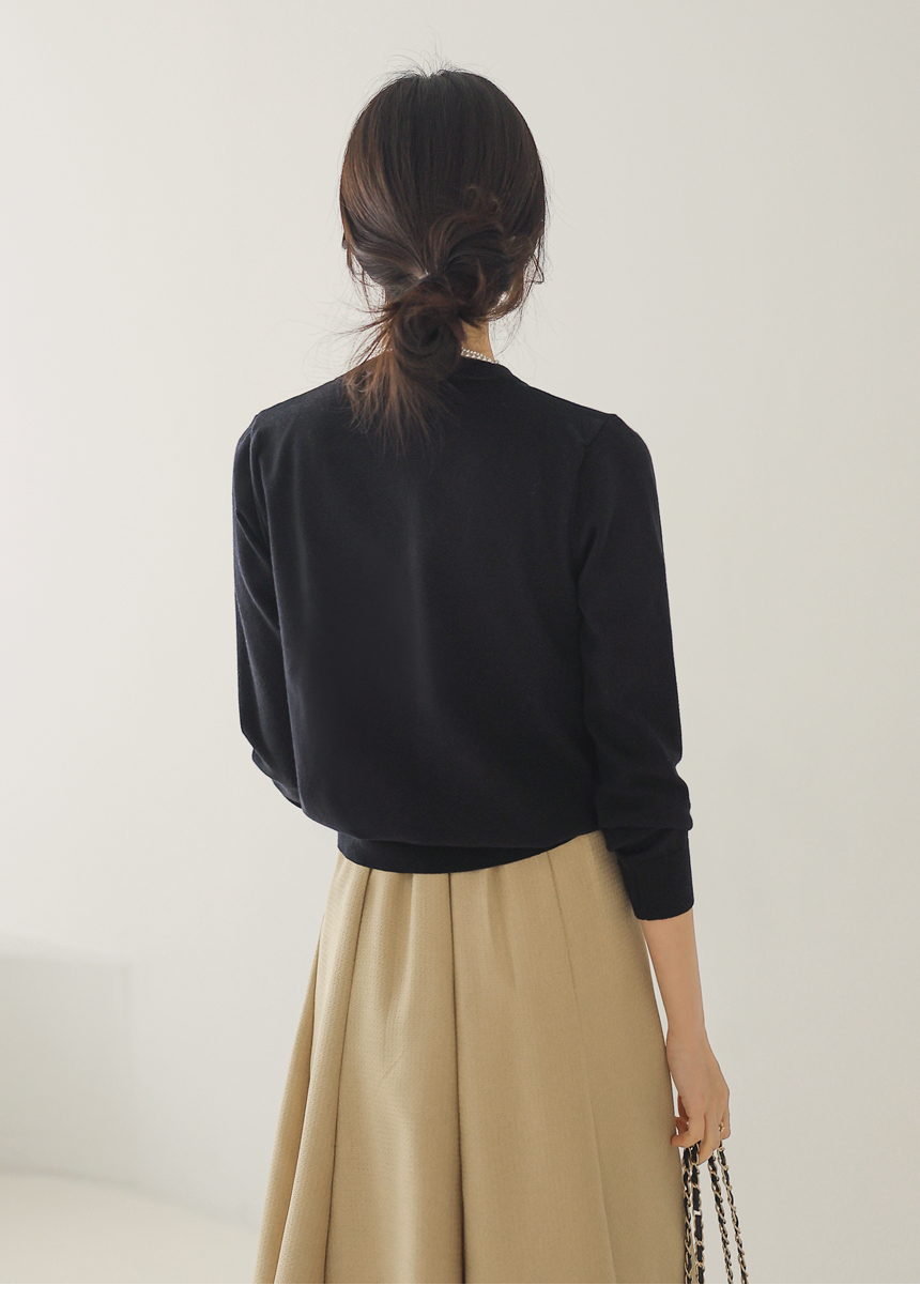 단정하게 떨어지는 라운드 네크라인 위로 섬세하게 더해진