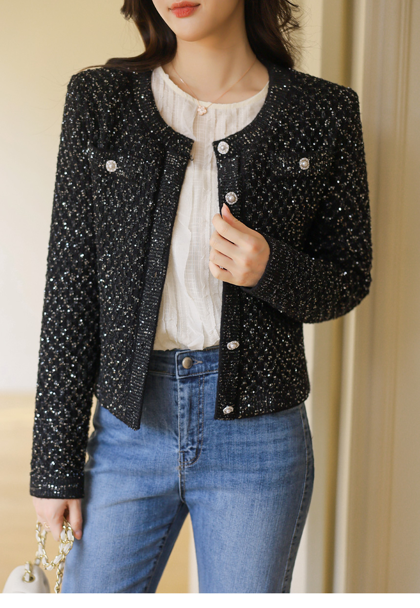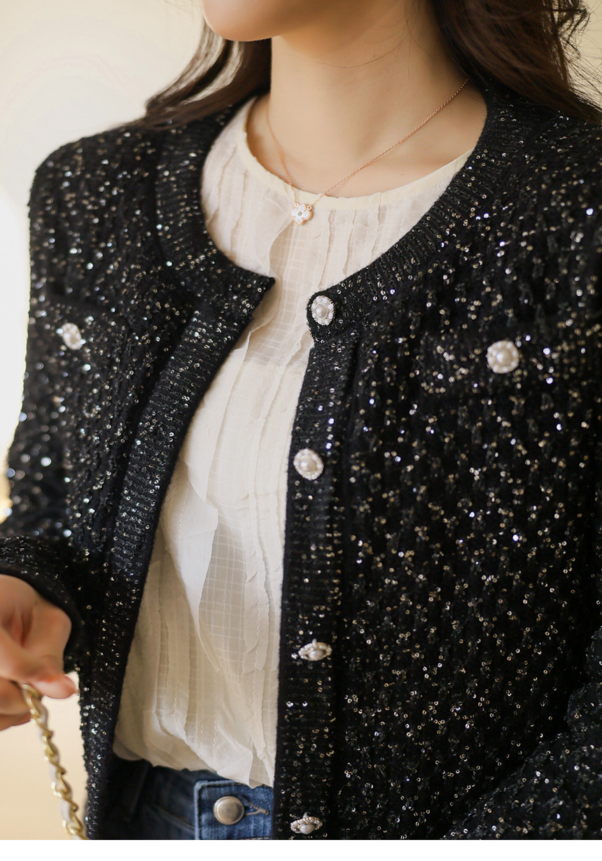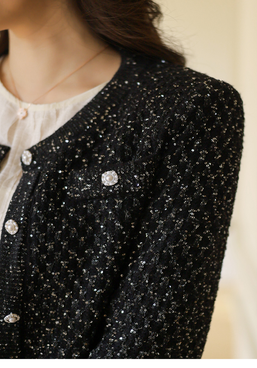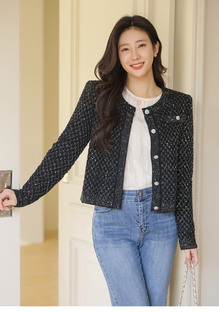 레일리 펄 스팽글 다이아 체크 패턴 니트 가디건