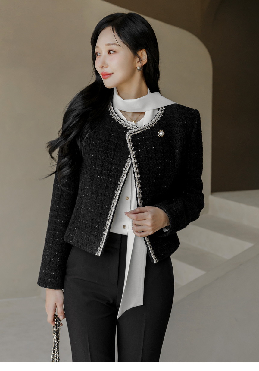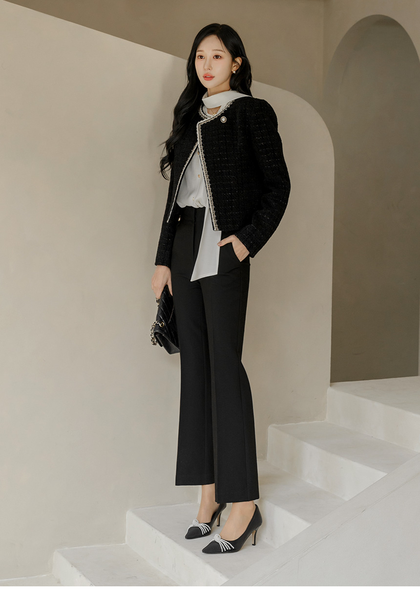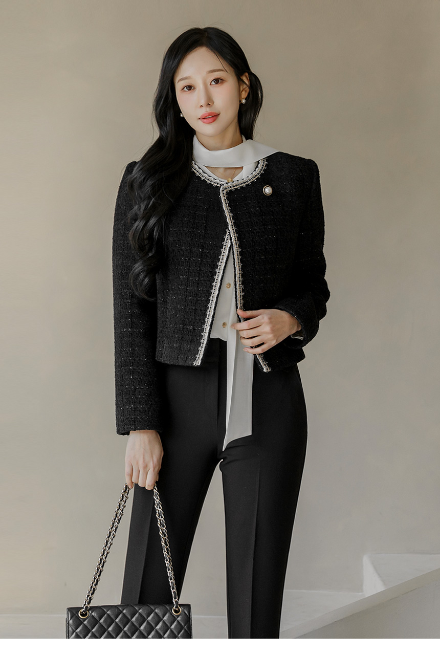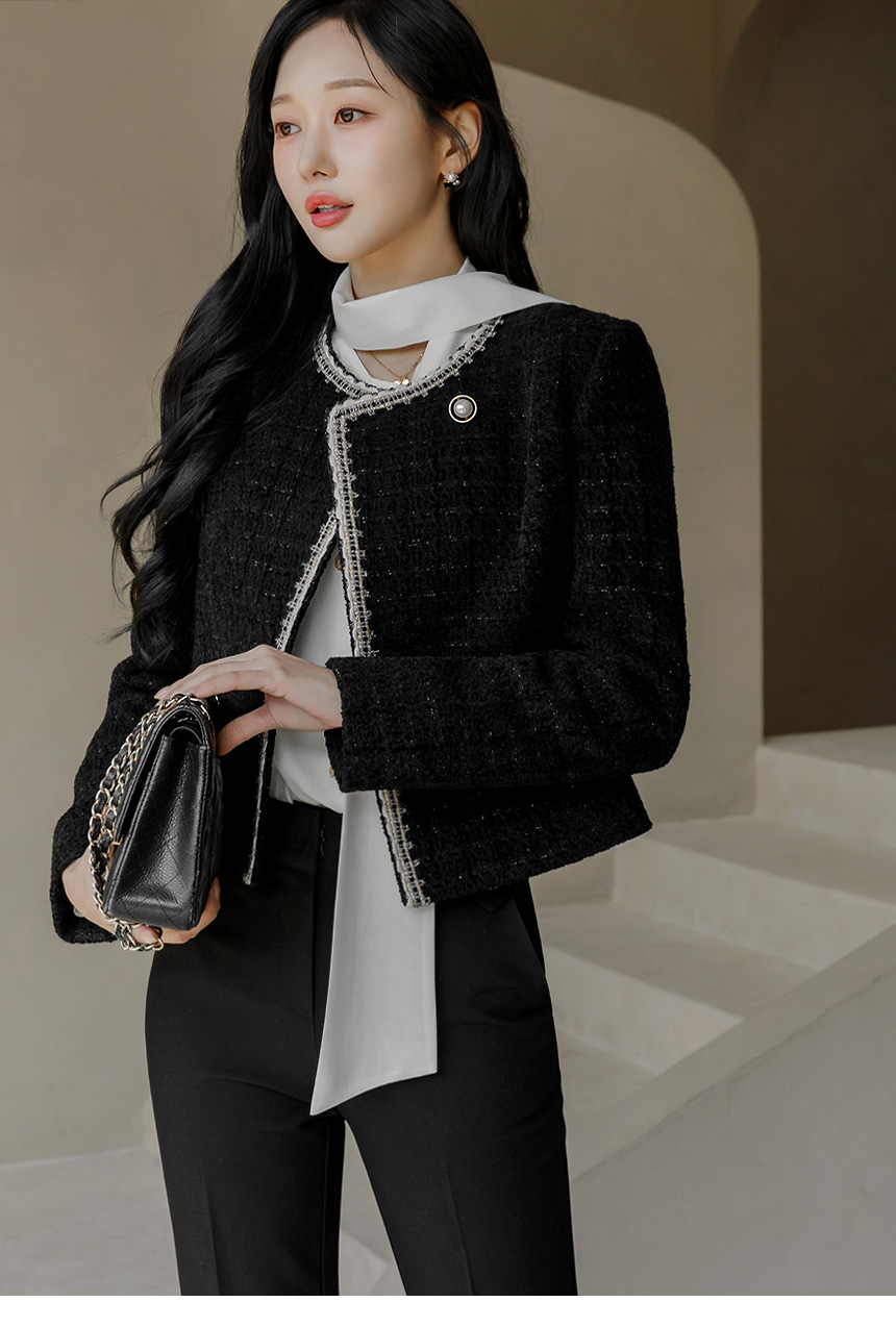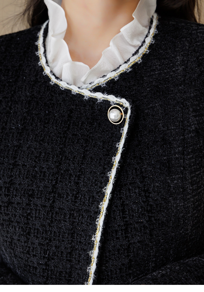 끝단에는 브레이드 라인을 배색해 트위드의 텍스쳐와