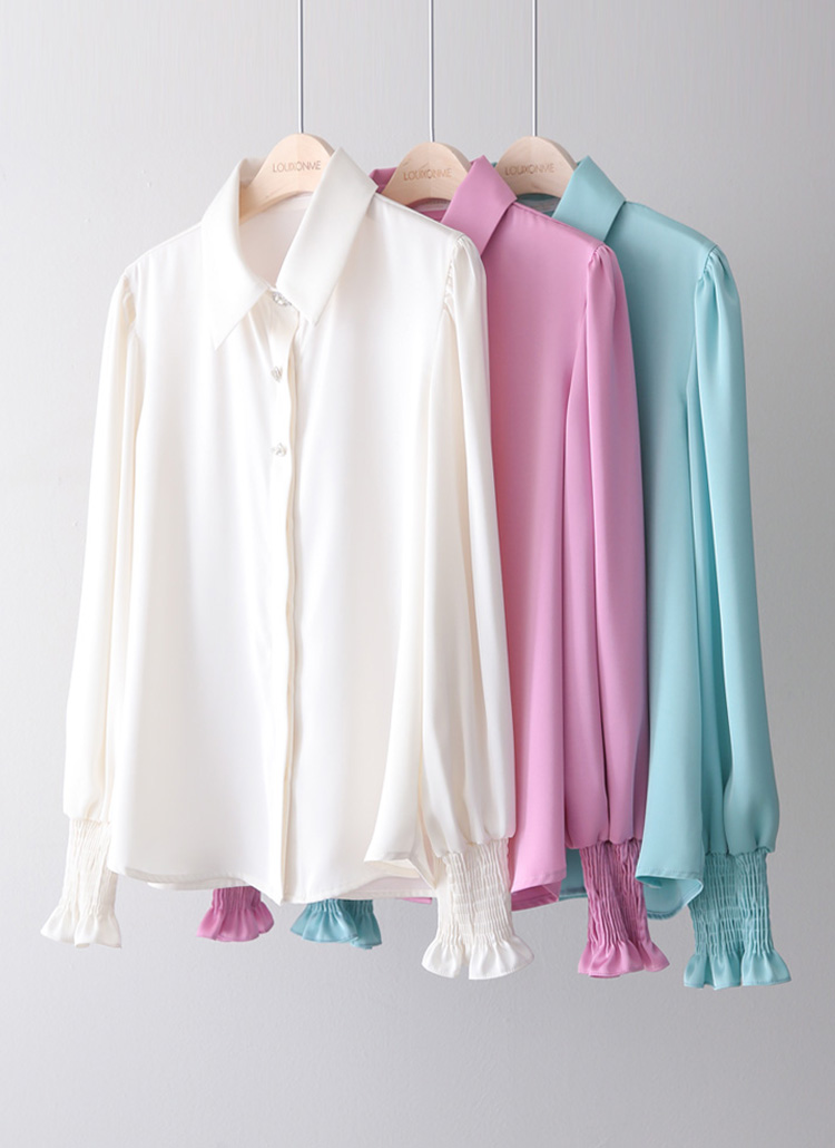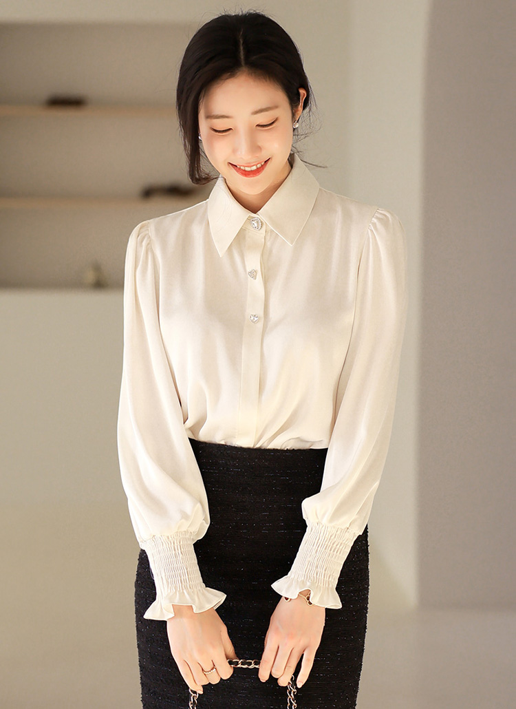 케딜라 쥬얼 하트 버튼 소매 스모킹 셔링 퍼프 새틴 블라우스