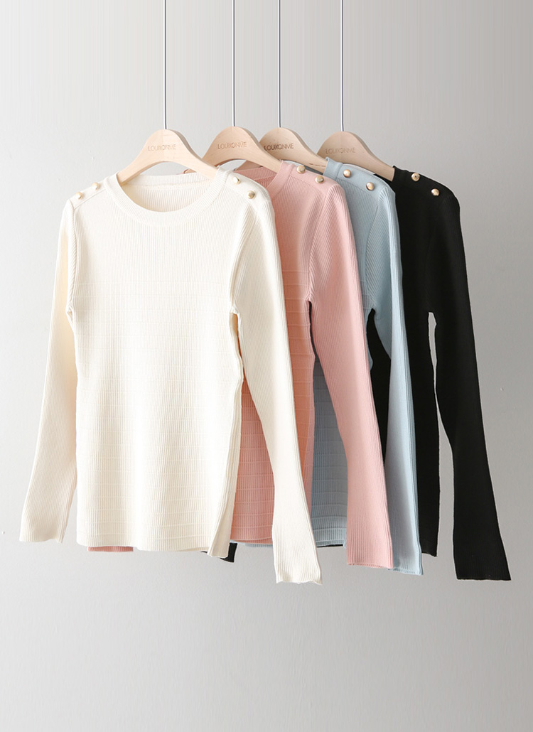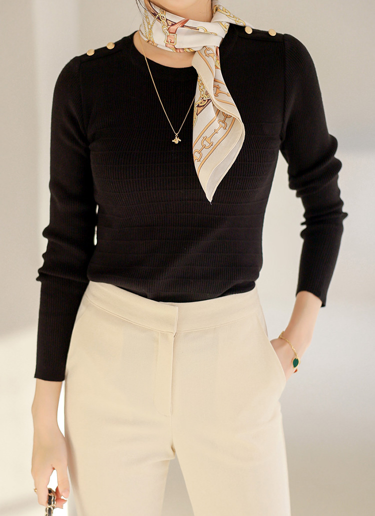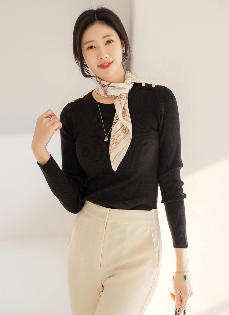 라티세 어깨 견장 골드 버튼 플래드 짜임 라운드 긴팔 니트