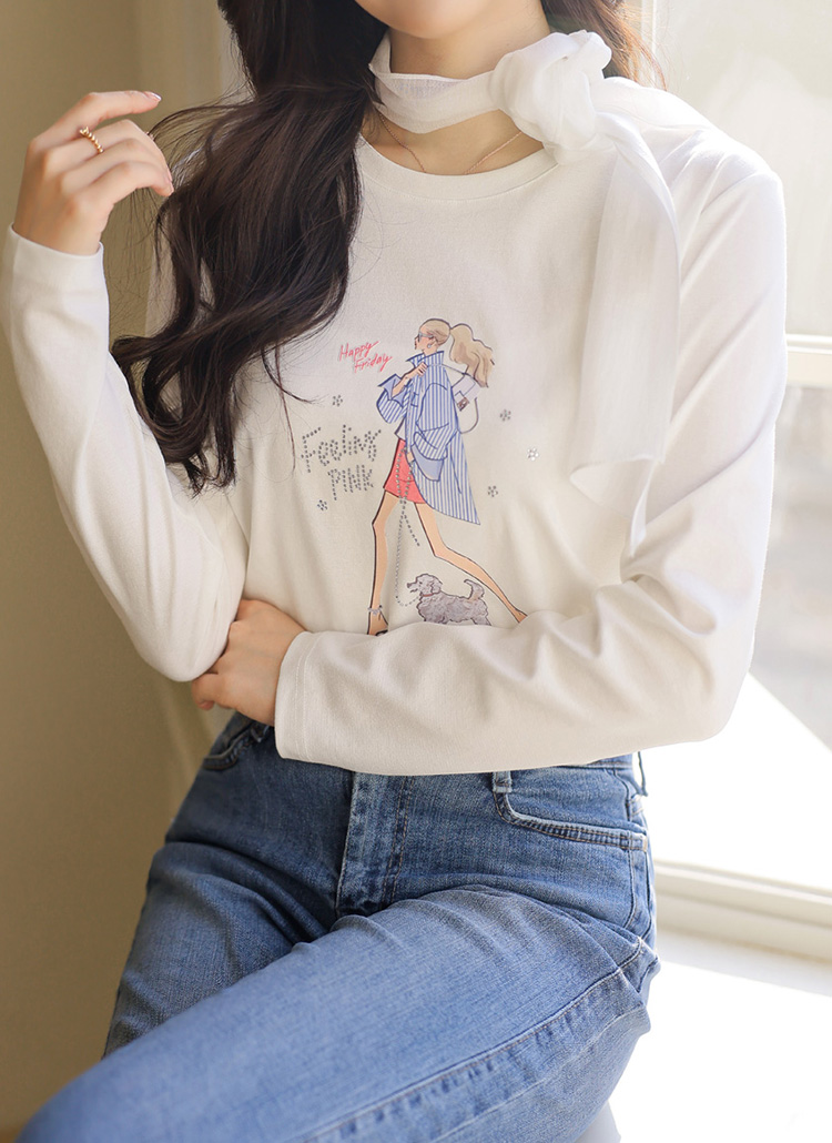 부드럽게 표현된 드로잉 프린팅 위에 반짝이는 핫픽스를 더해