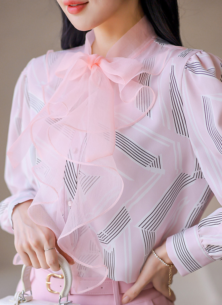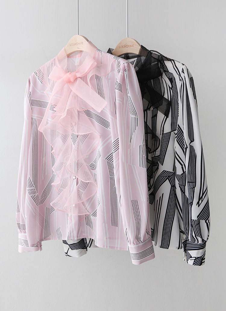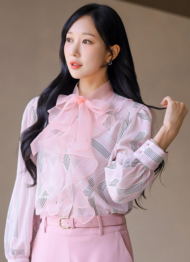 헤니엔 쉬폰 셔링 러플 리본 넥 기하학 스트라이프 블라우스