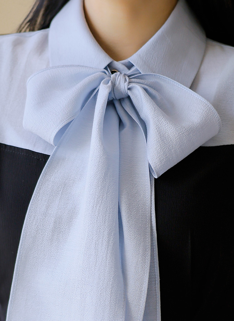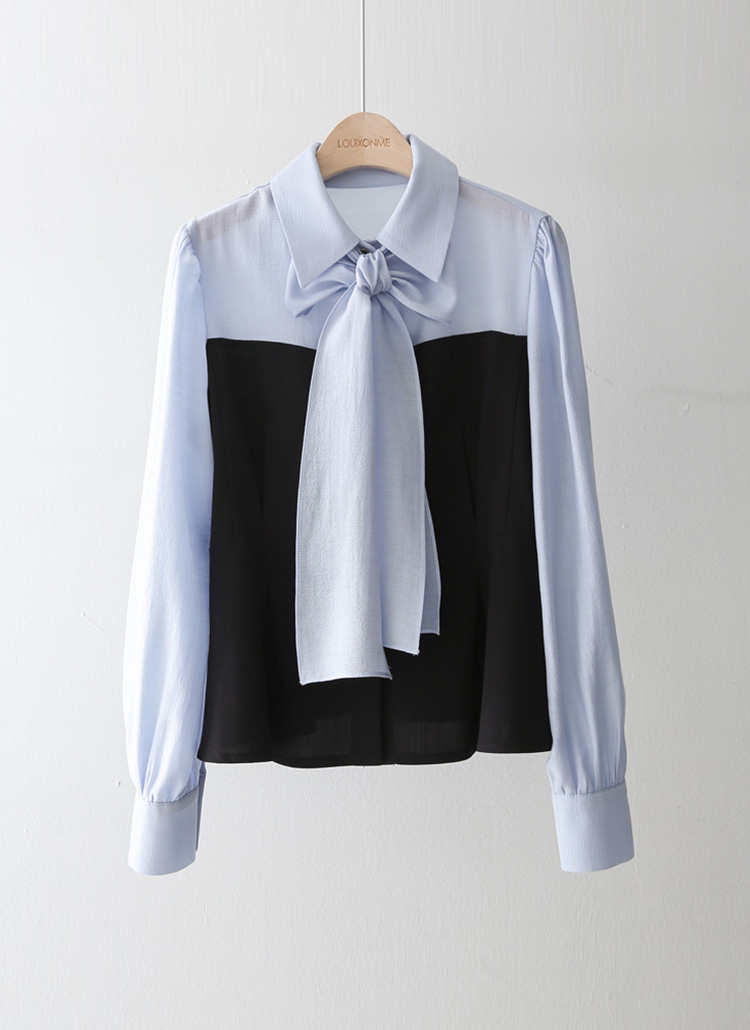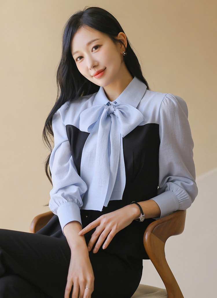 [LouisAngel] 블레스 타이 리본SET 하트라인 배색 핀턱 페플럼 카라 블라우스