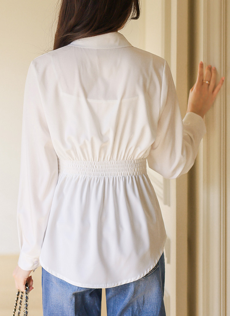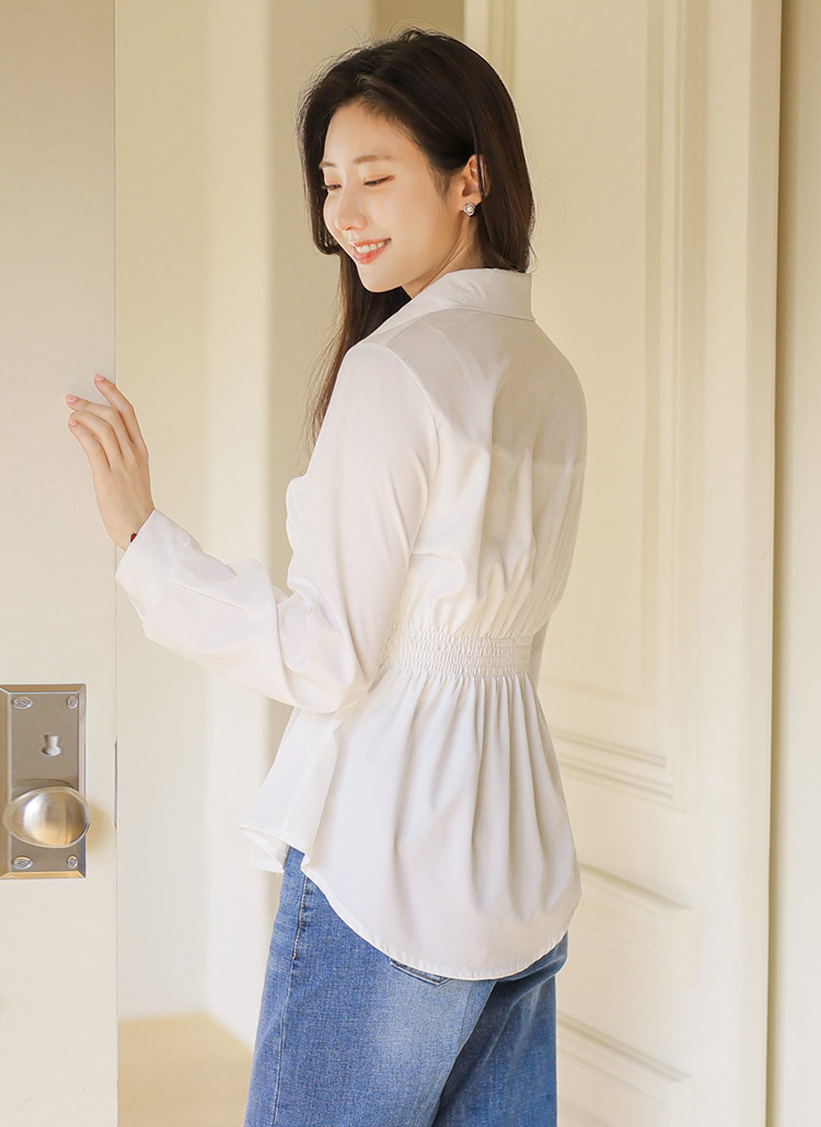 르네아 허리 비조 버튼 백 스모킹 밴딩 셔링 카라 블라우스