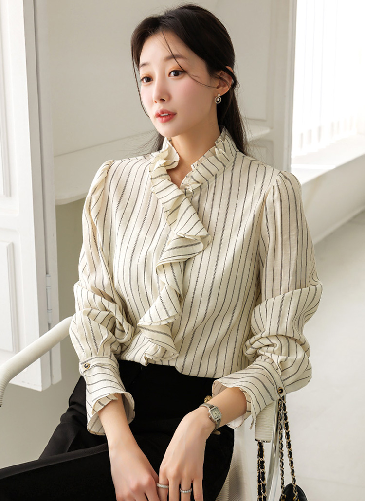 [LouisAngel] 레이얼 언발 프릴 러플 꽃잎 넥 퍼프 벨소매 스트라이프 블라우스