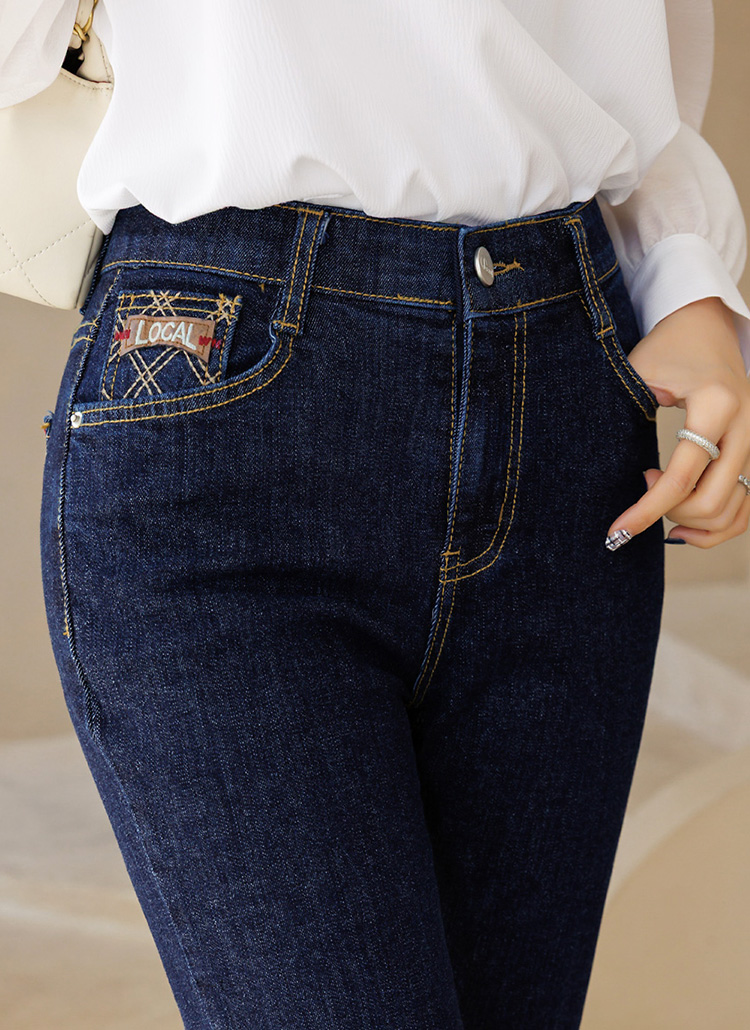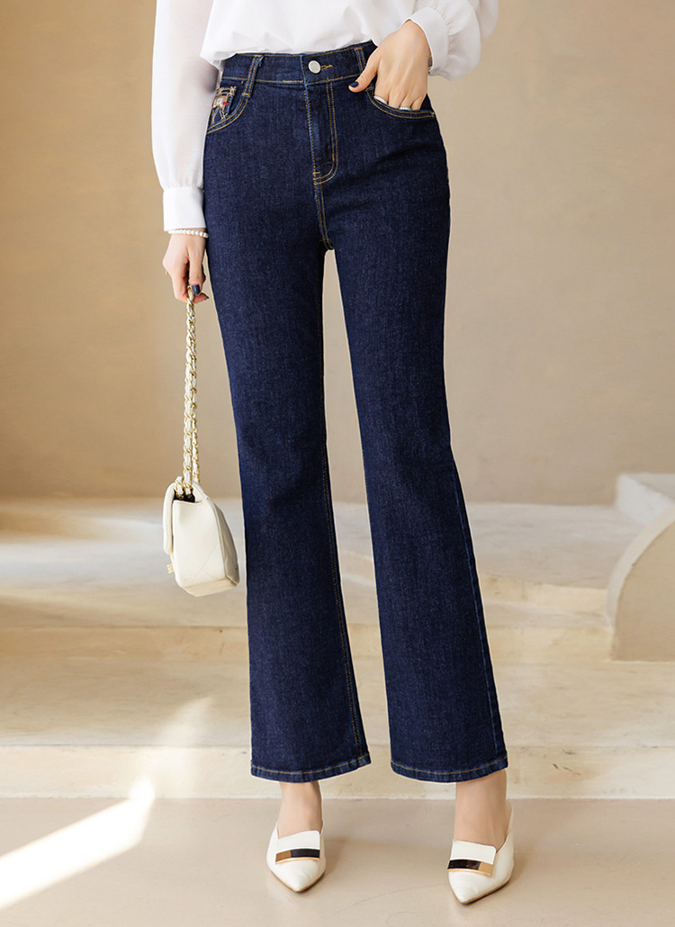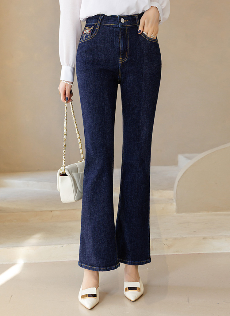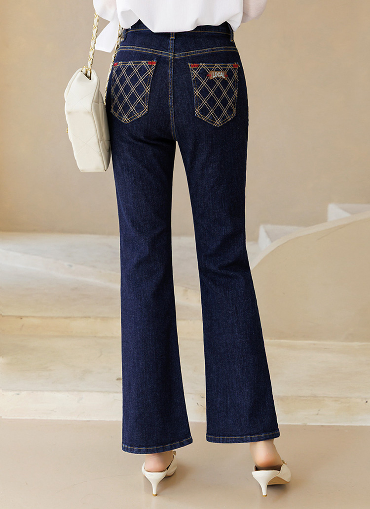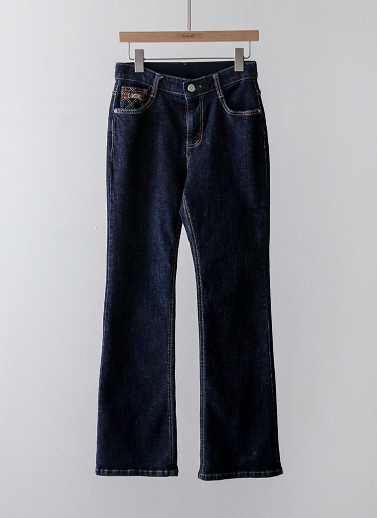 플레보 다이아 스티치 자수 포인트 진청 슬림 부츠컷 데님 팬츠