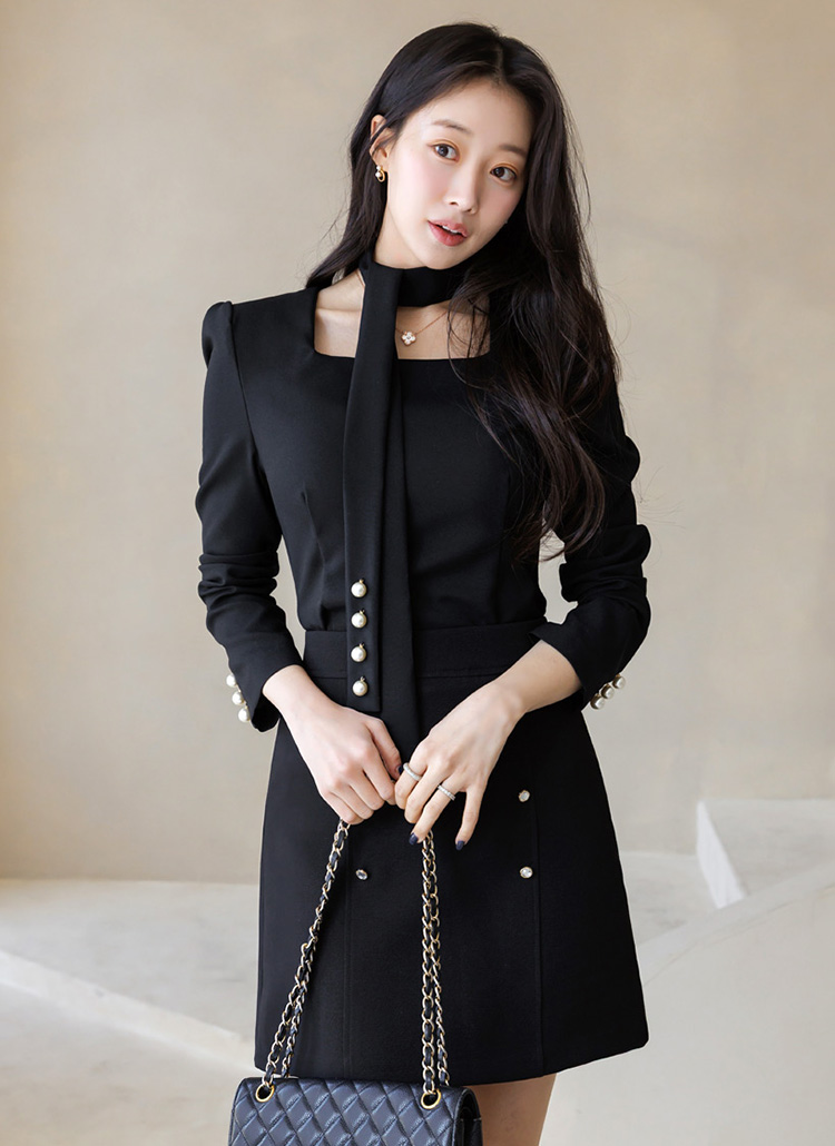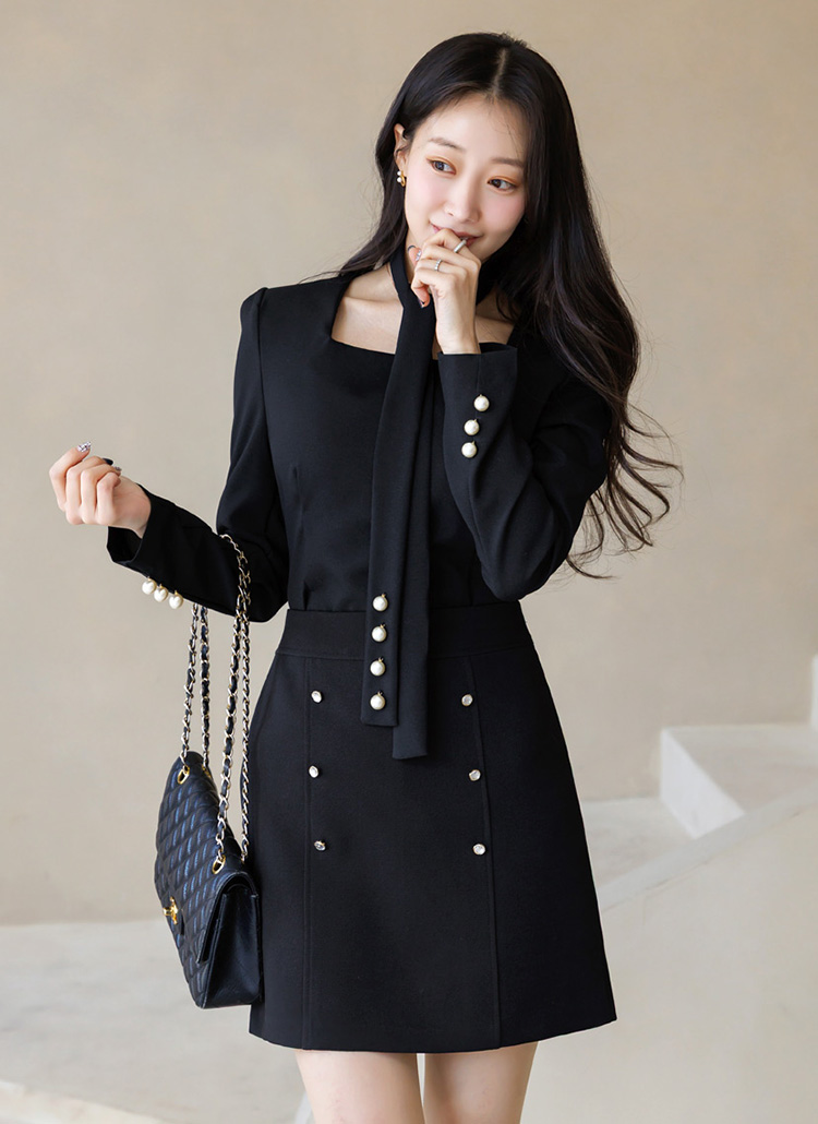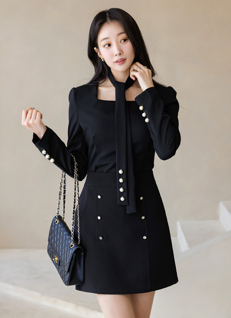 시엘라 왕진주 디테일 리본 타이SET 스퀘어넥 블라우스