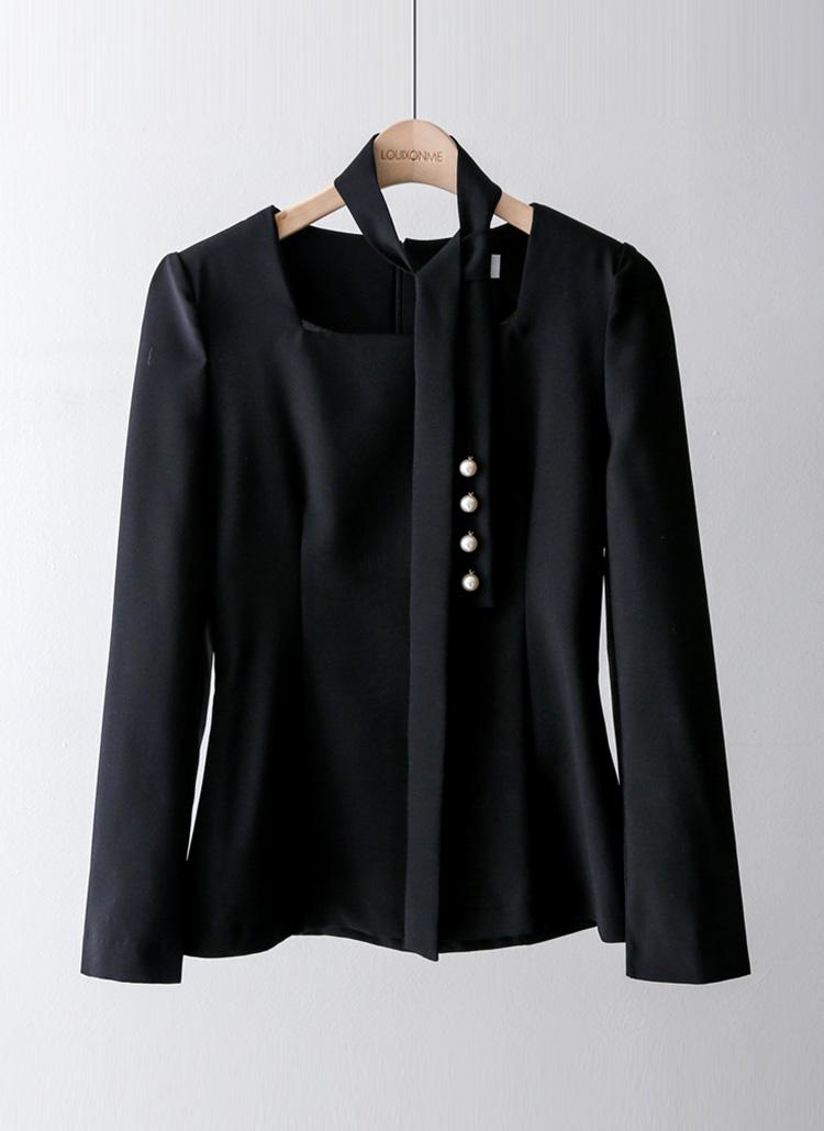 왕진주 디테일이 우아하게 돋보이는 스퀘어넥 블라우스에요