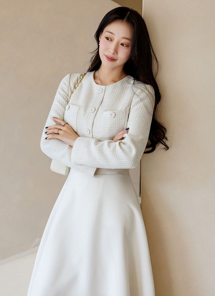 트위드 자켓과 스커트를 함께 스타일링한 듯한