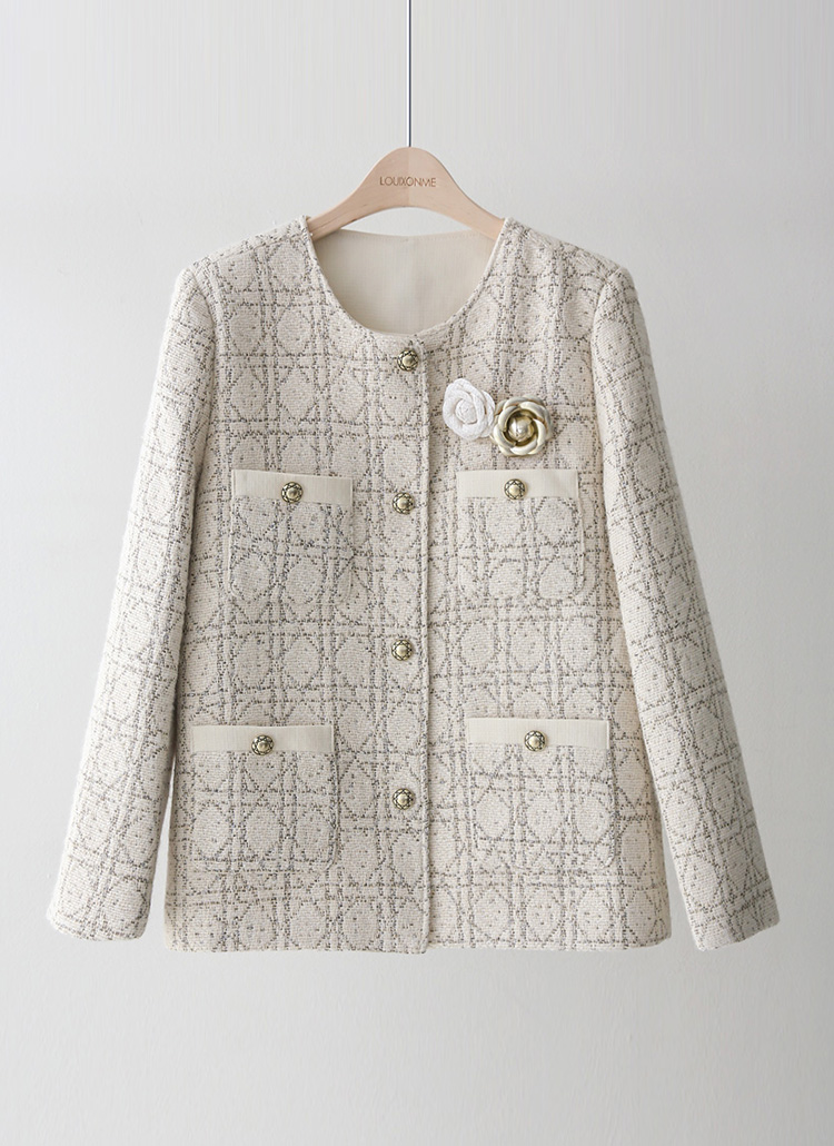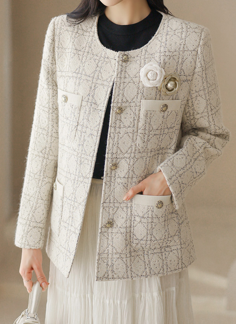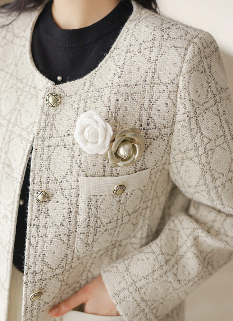 리제인 투 플라워 코사지SET 다이아 울블렌딩 트위드 노카라 미드 자켓