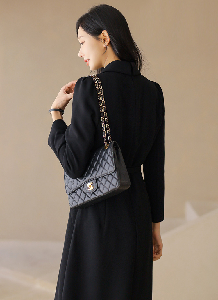 단정하고 세련된 분위기가 돋보이는 클래식 미디 블랙 원피스에요