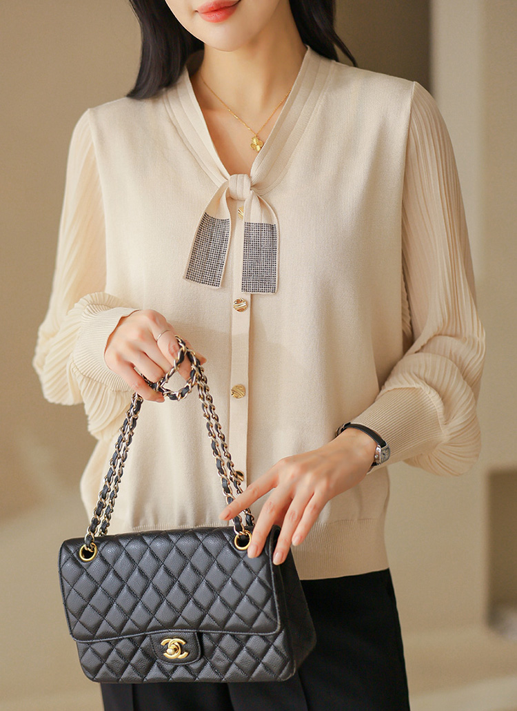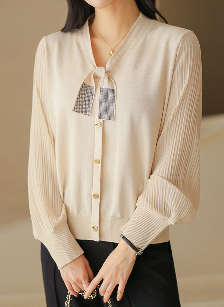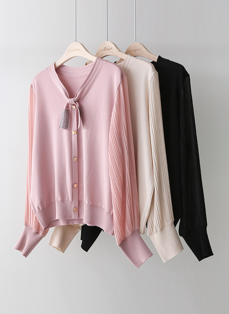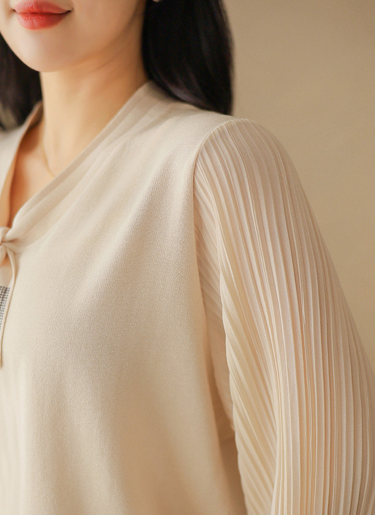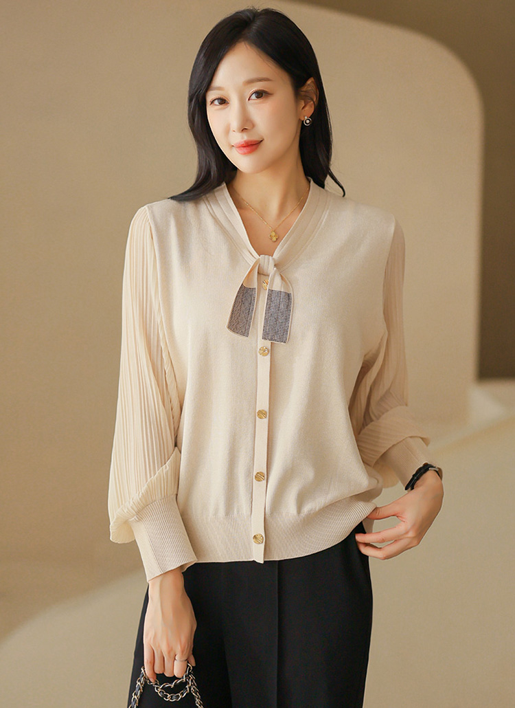델리브 플리츠 쉬폰 소매 배색 리본 타이 니트 블라우스