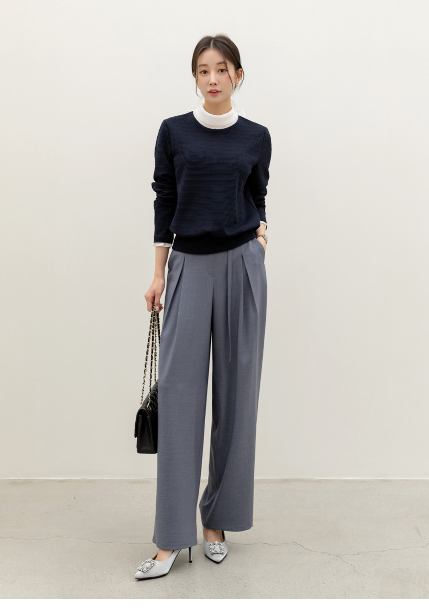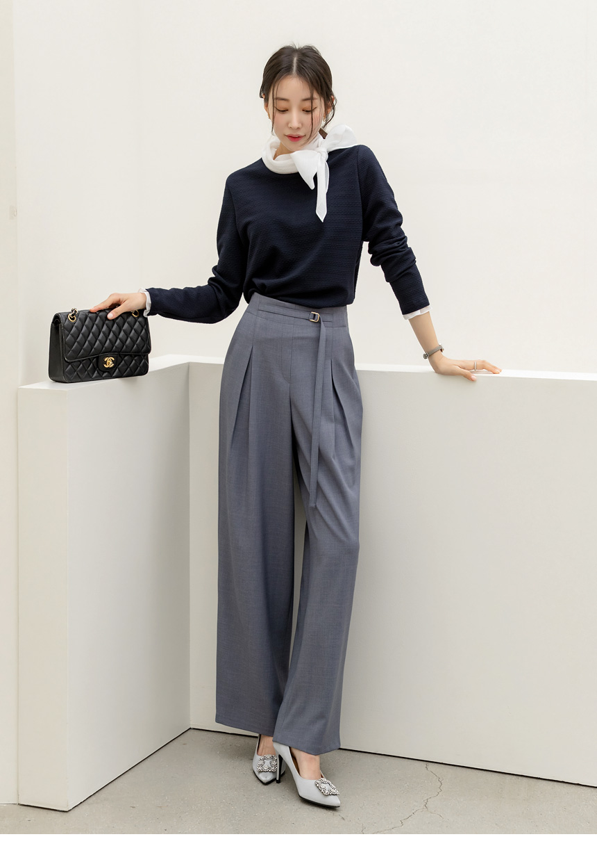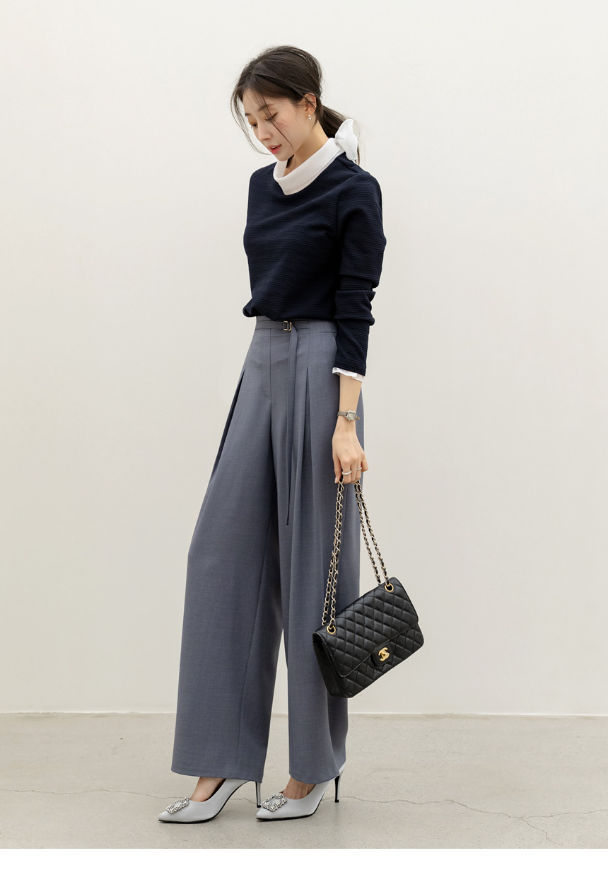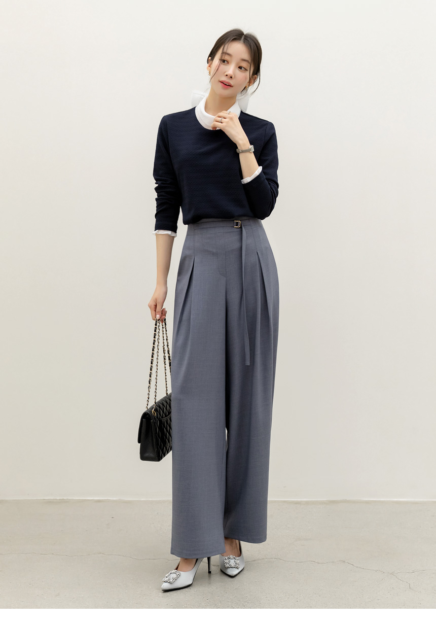 • 데미아 허리 비조 벨티드 맞주름 핀턱 세미 와이드 슬랙스 팬츠