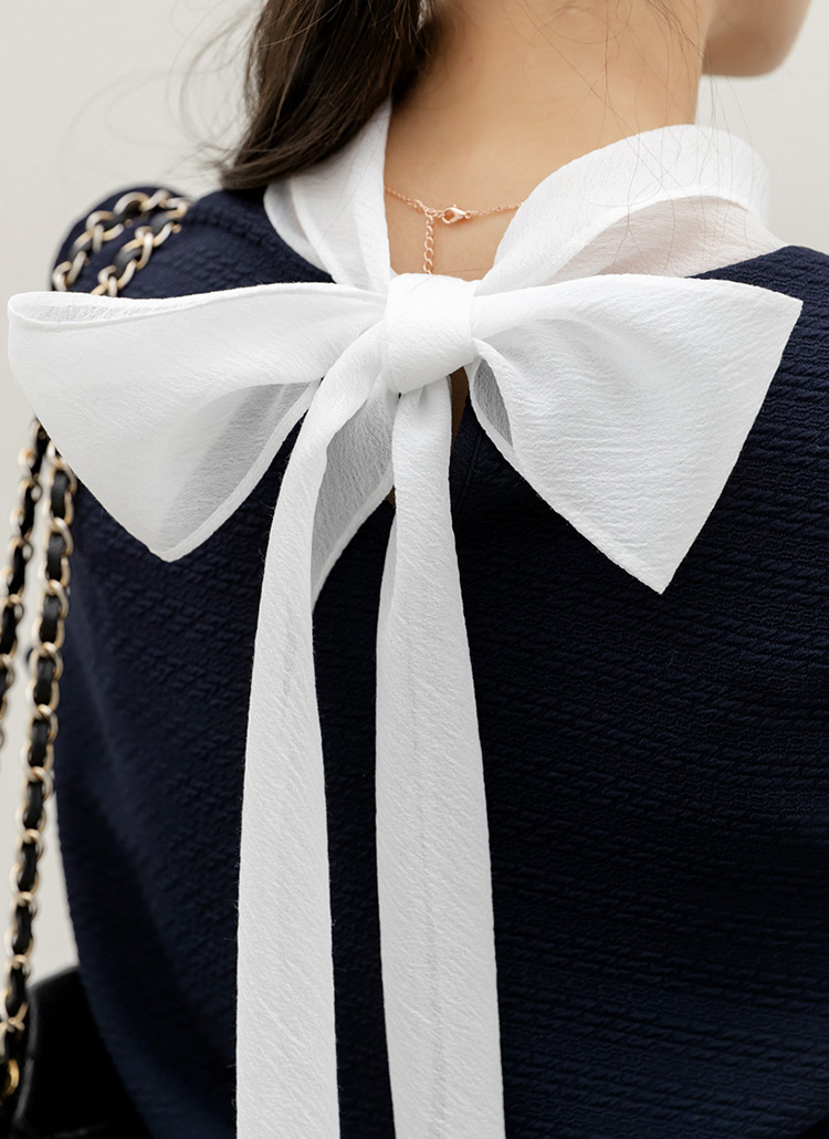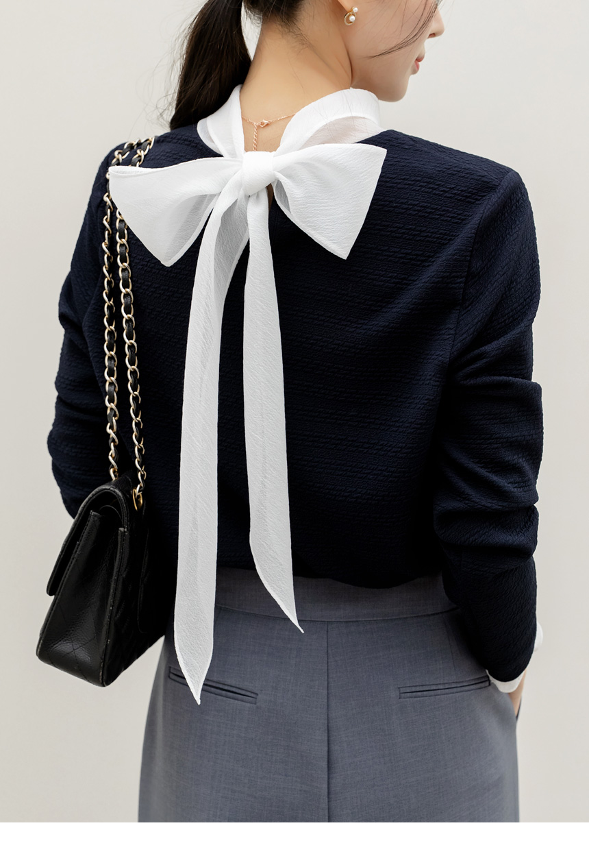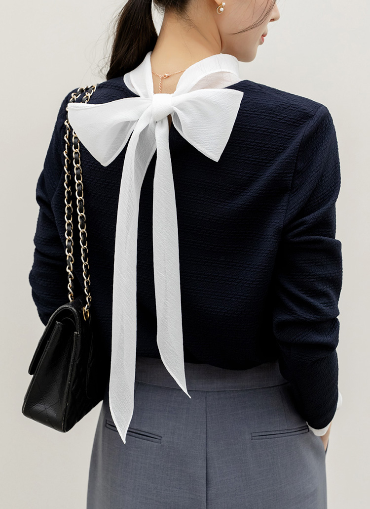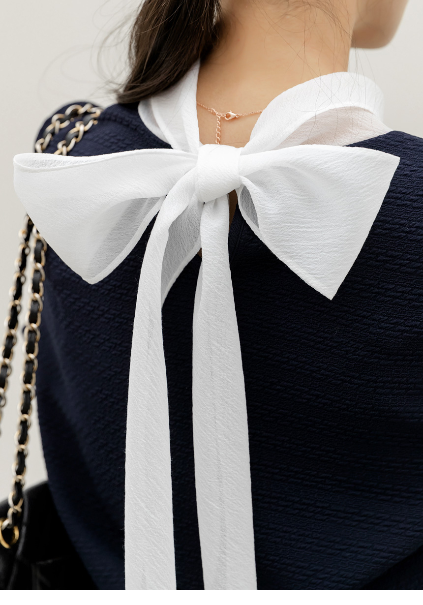 [LouisAngel] 헤안느 쉬폰 배색 리본 타이 넥 쟈가드 블라우스 티