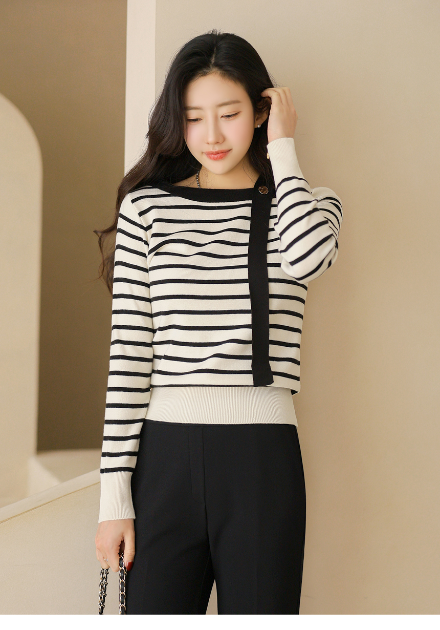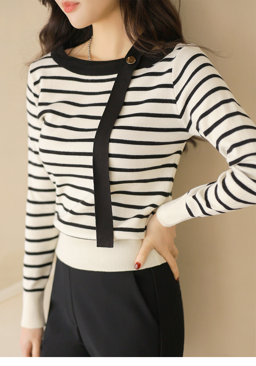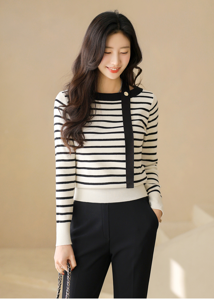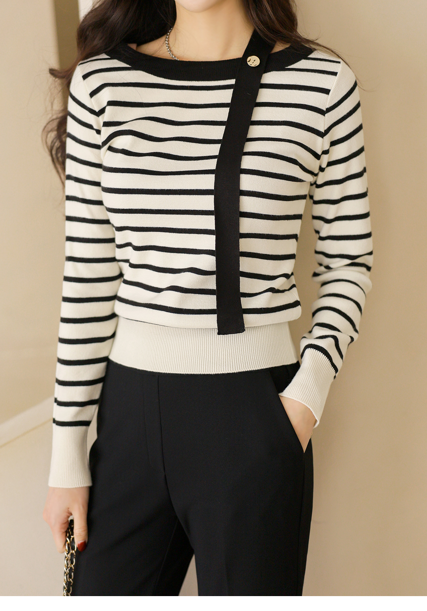 로베드 어깨 배색 리본 스트라이프 라운드 니트