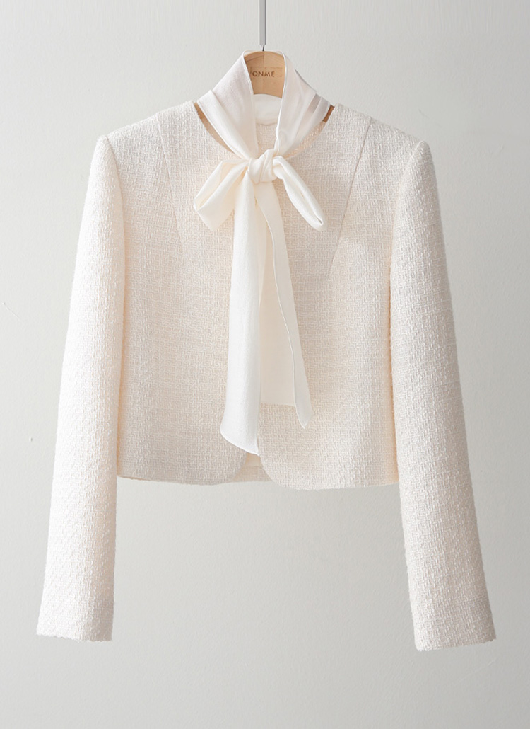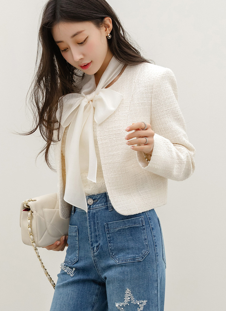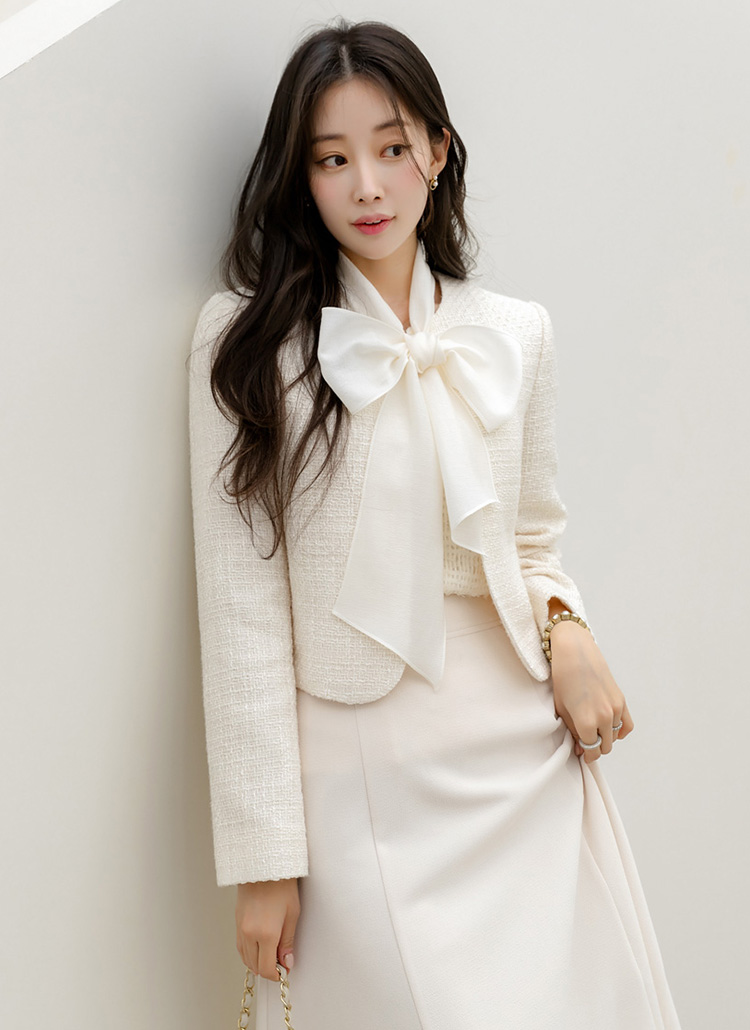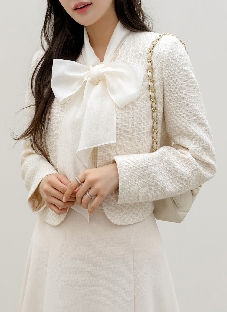 [LouisAngel] 리오웬 쉬폰 리본 스카프SET 노카라 은은 펄 트위드 자켓