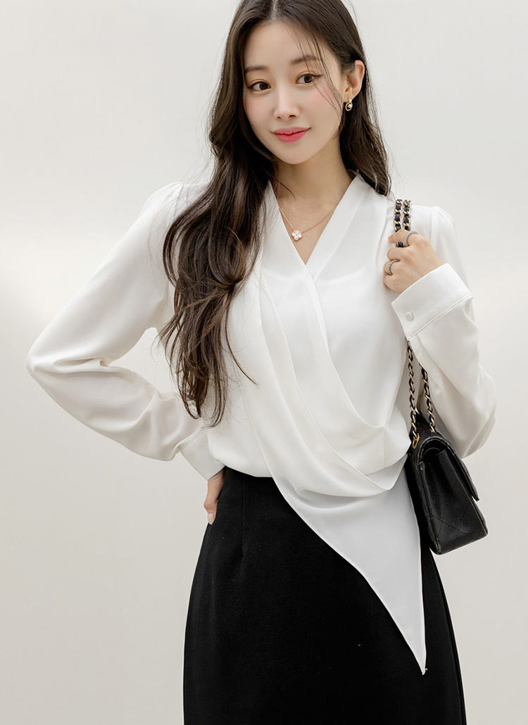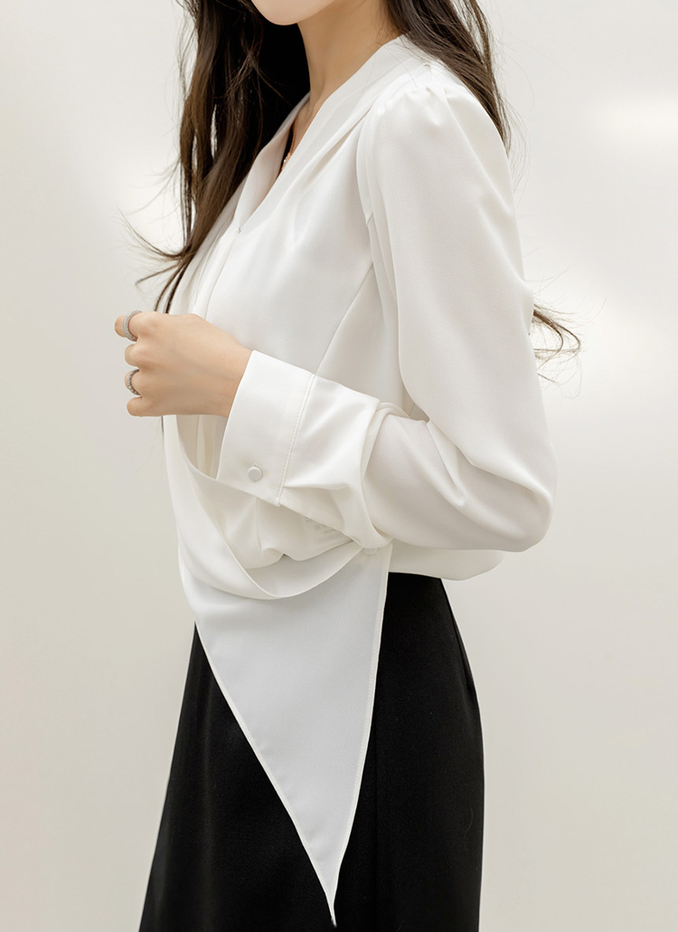 루비엔 언발란스 핀턱 셔링 드레이프 랩 블라우스