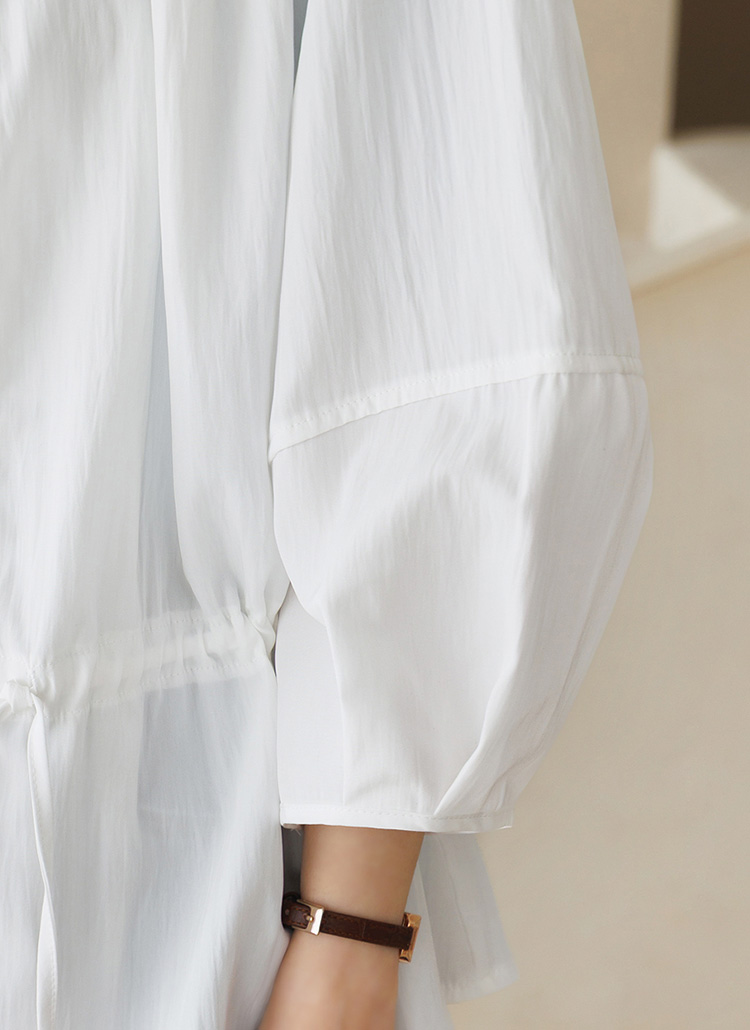 볼륨감 있는 7부 벌룬 소매는 팔 라인을 부드럽게 커버해주어