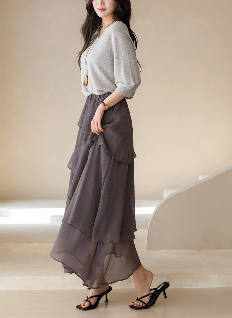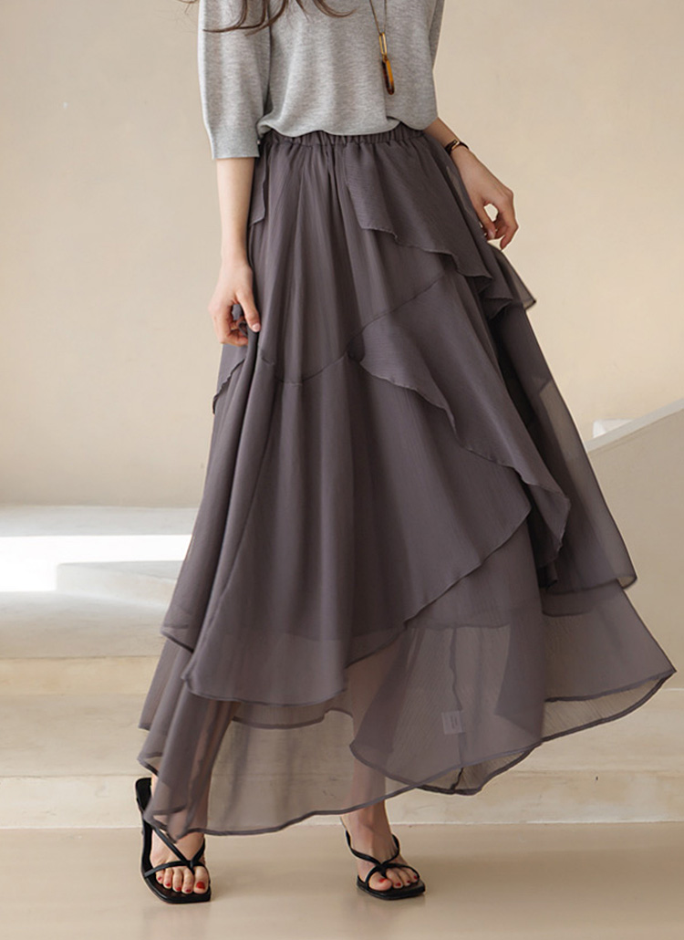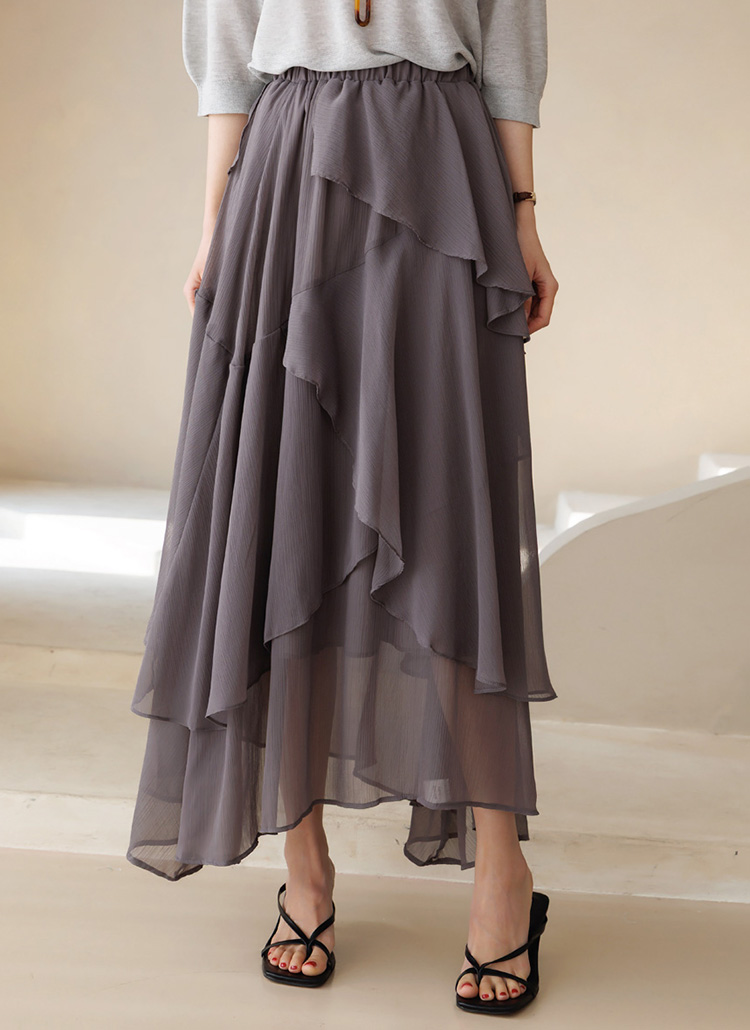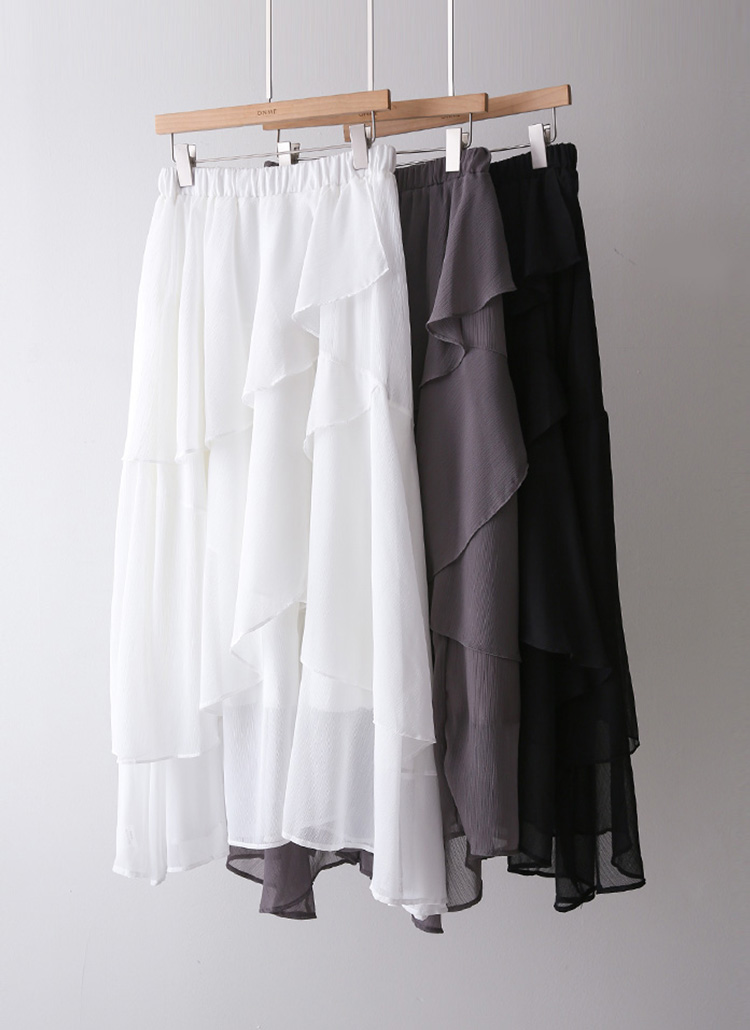 [Theonme] 에디나 언발란스 꽃잎 프릴 캉캉 셔링 A라인 롱 플레어 쉬폰 스커트