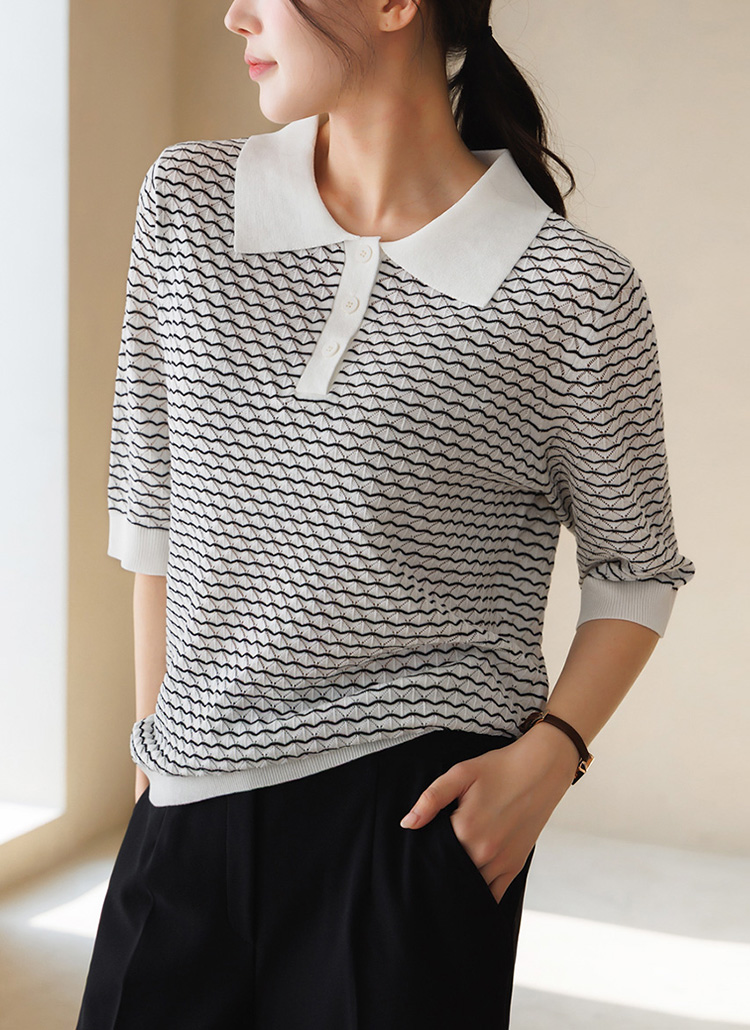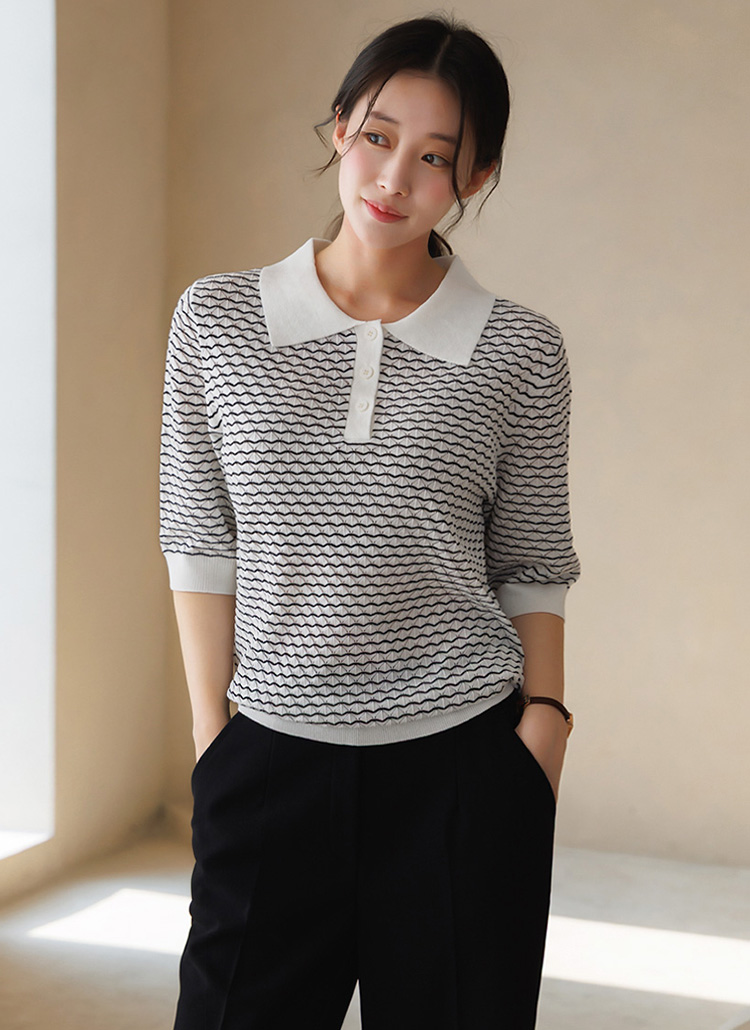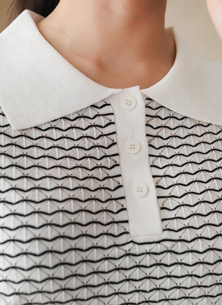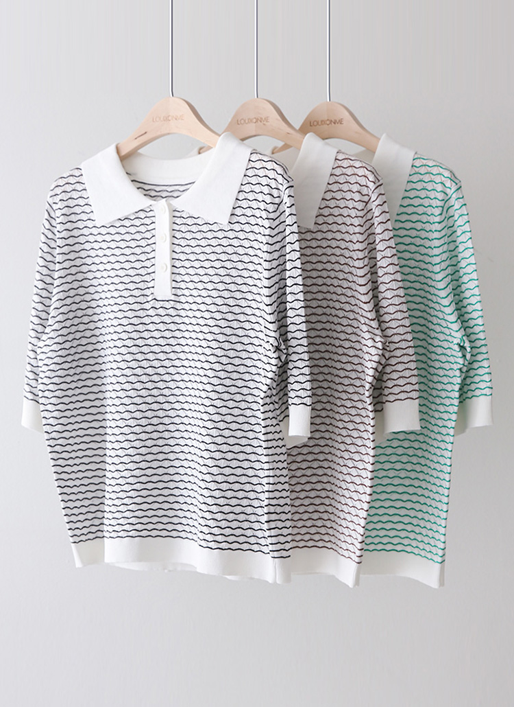[Theonme] 스니티 물결 스트라이프 쟈가드 스카시 5부소매 카라 니트