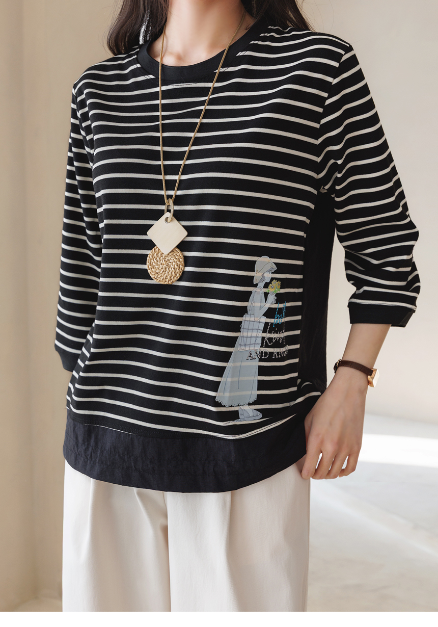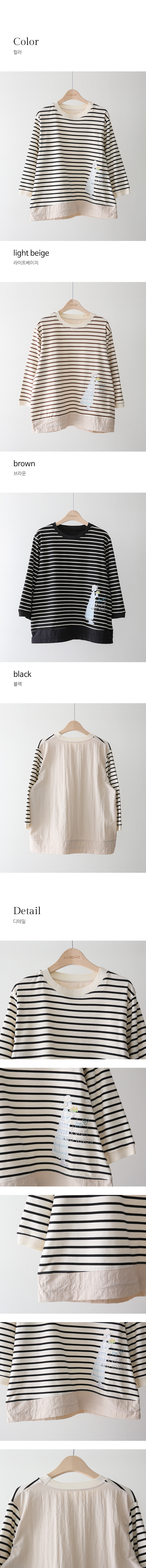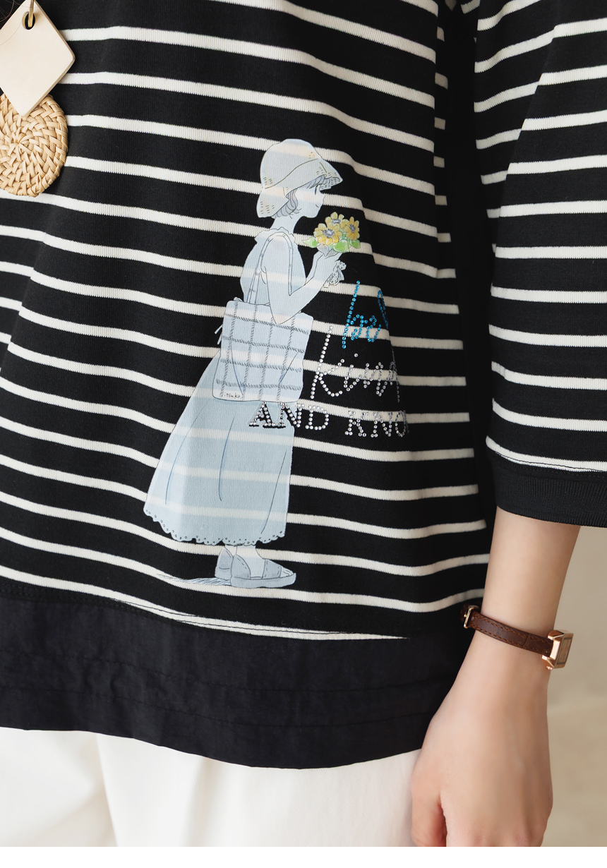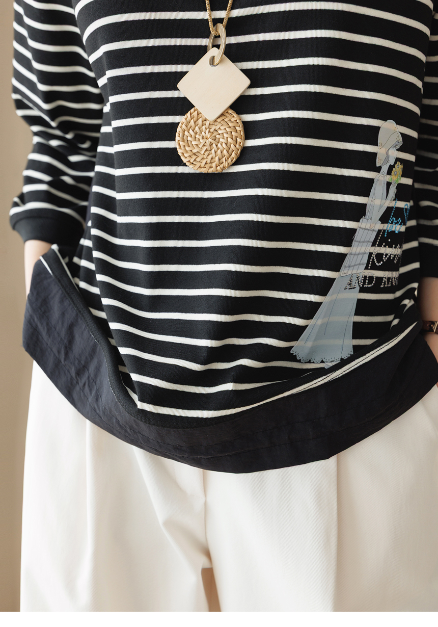 [Theonme] 헤이플 밑단 스트링 스프링걸 프린팅 스트라이프 배색 티셔츠