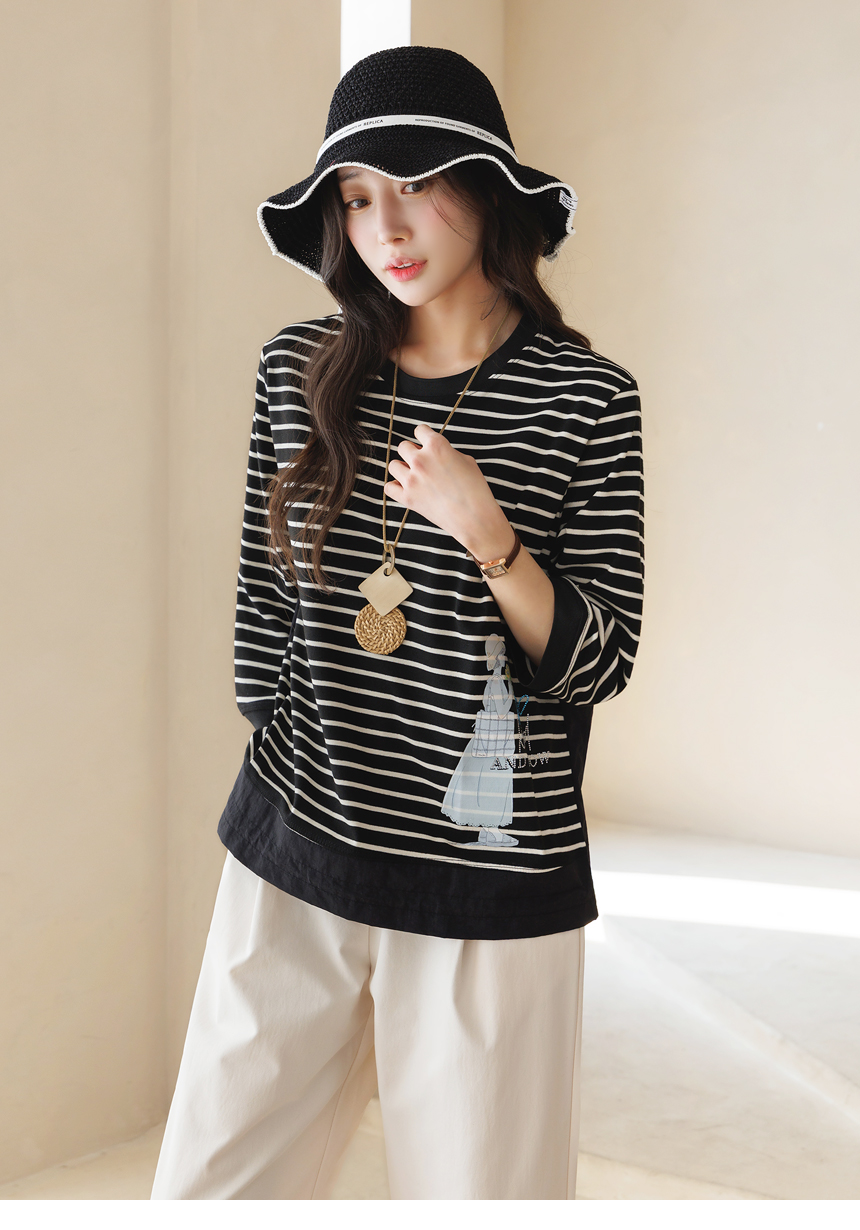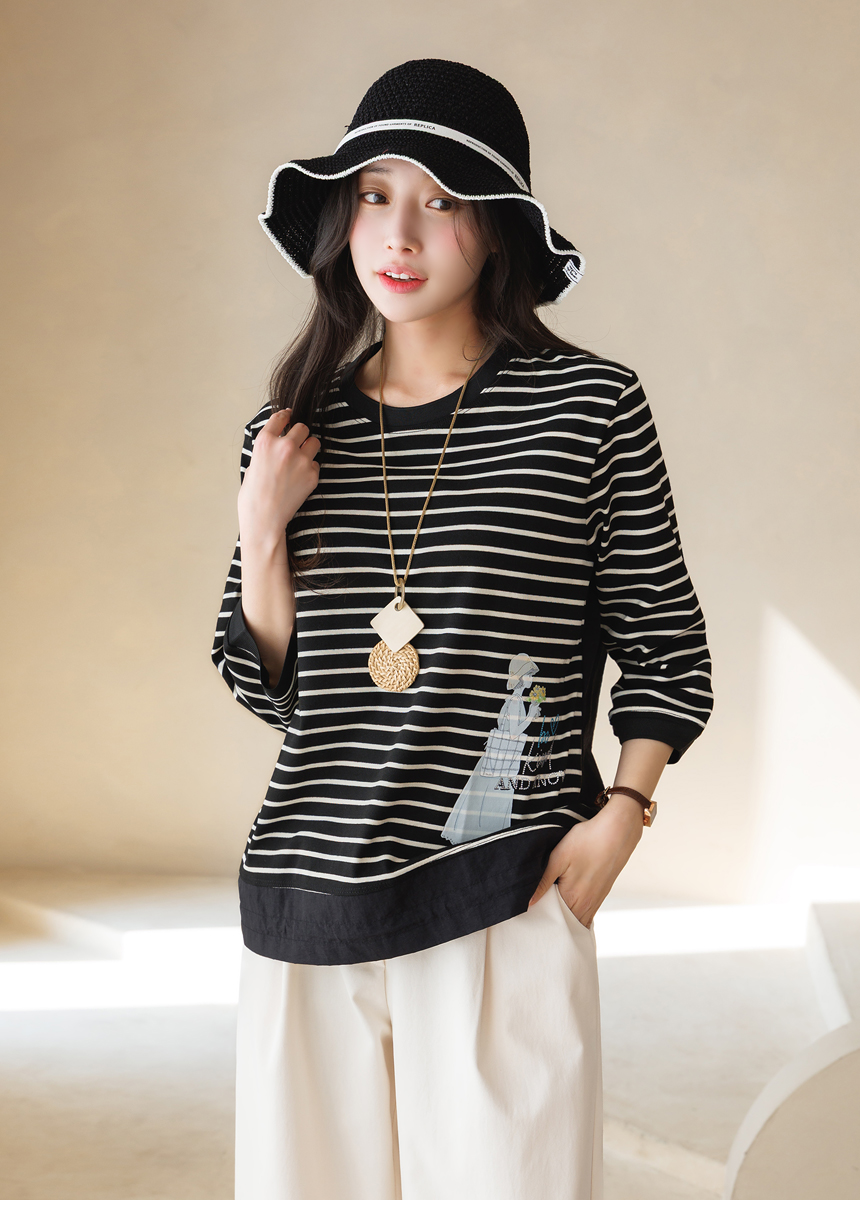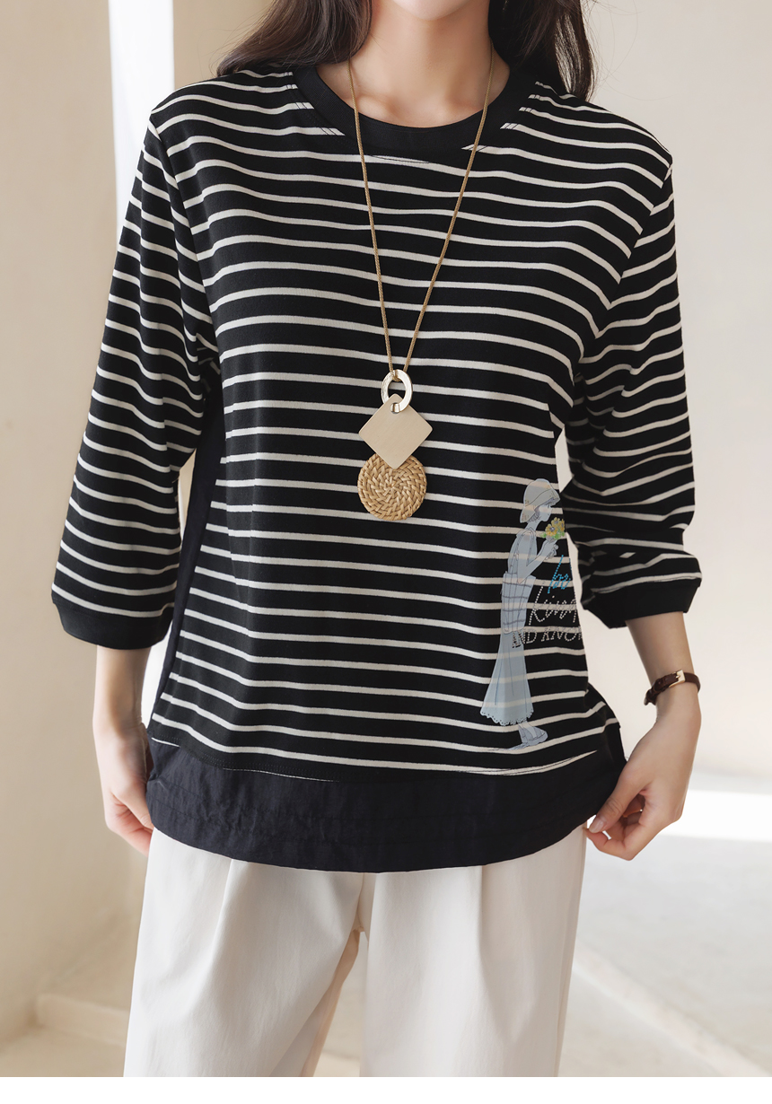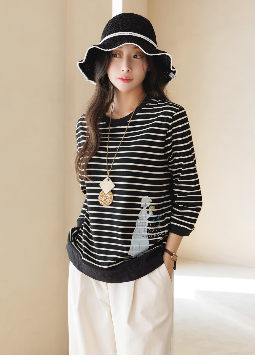 [Theonme] 헤이플 밑단 스트링 스프링걸 프린팅 스트라이프 배색 티셔츠