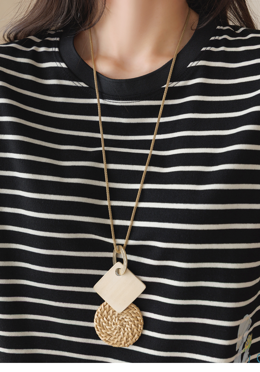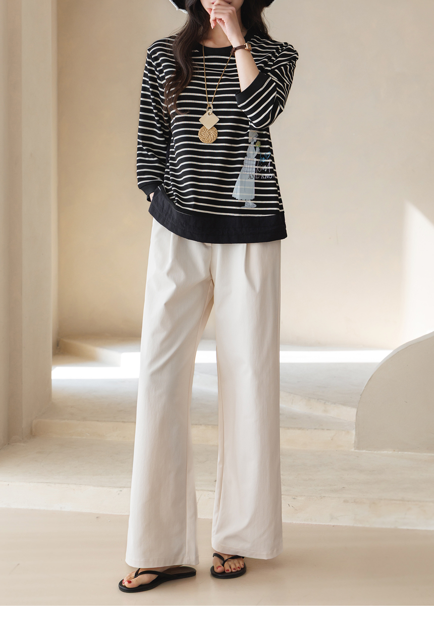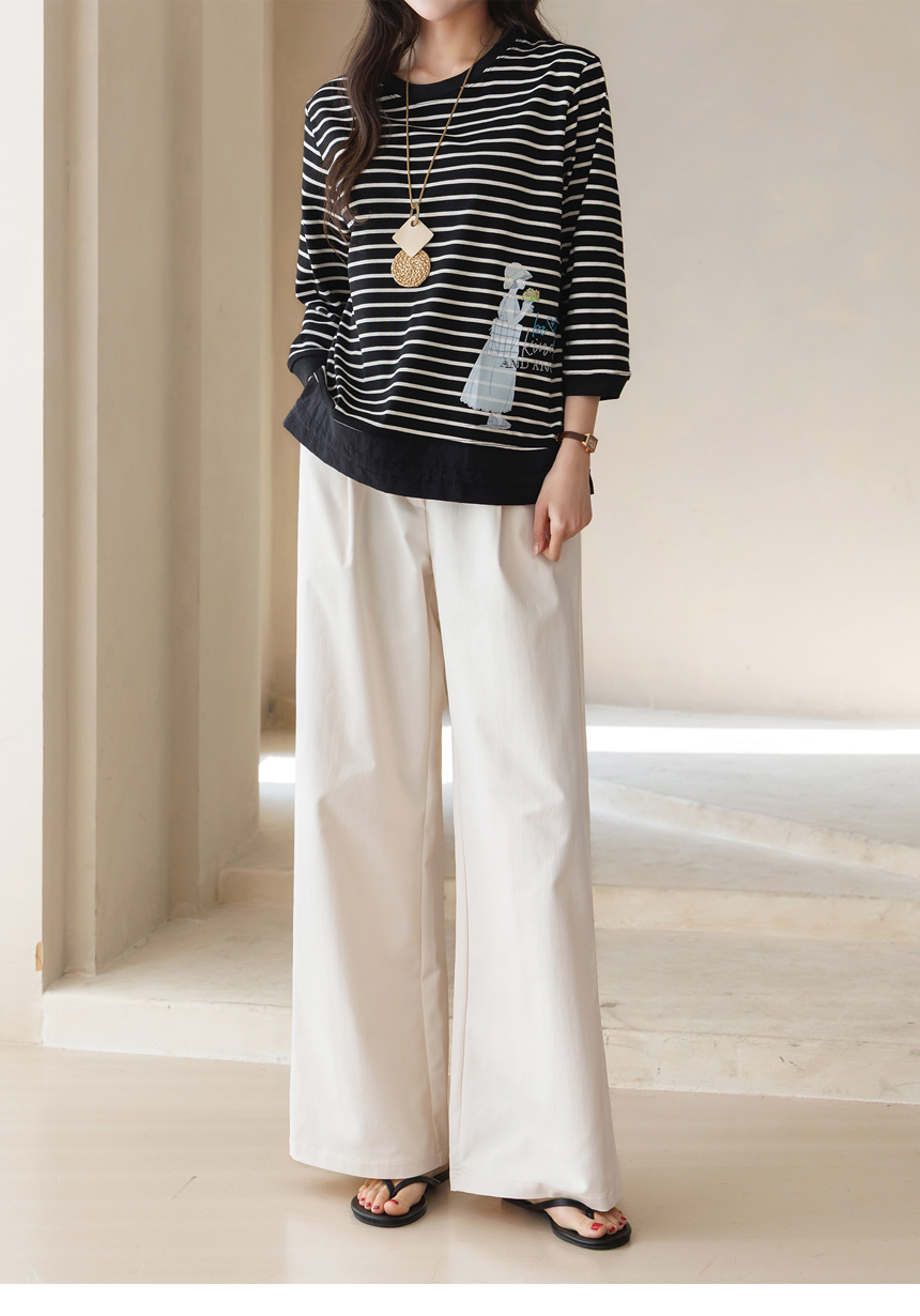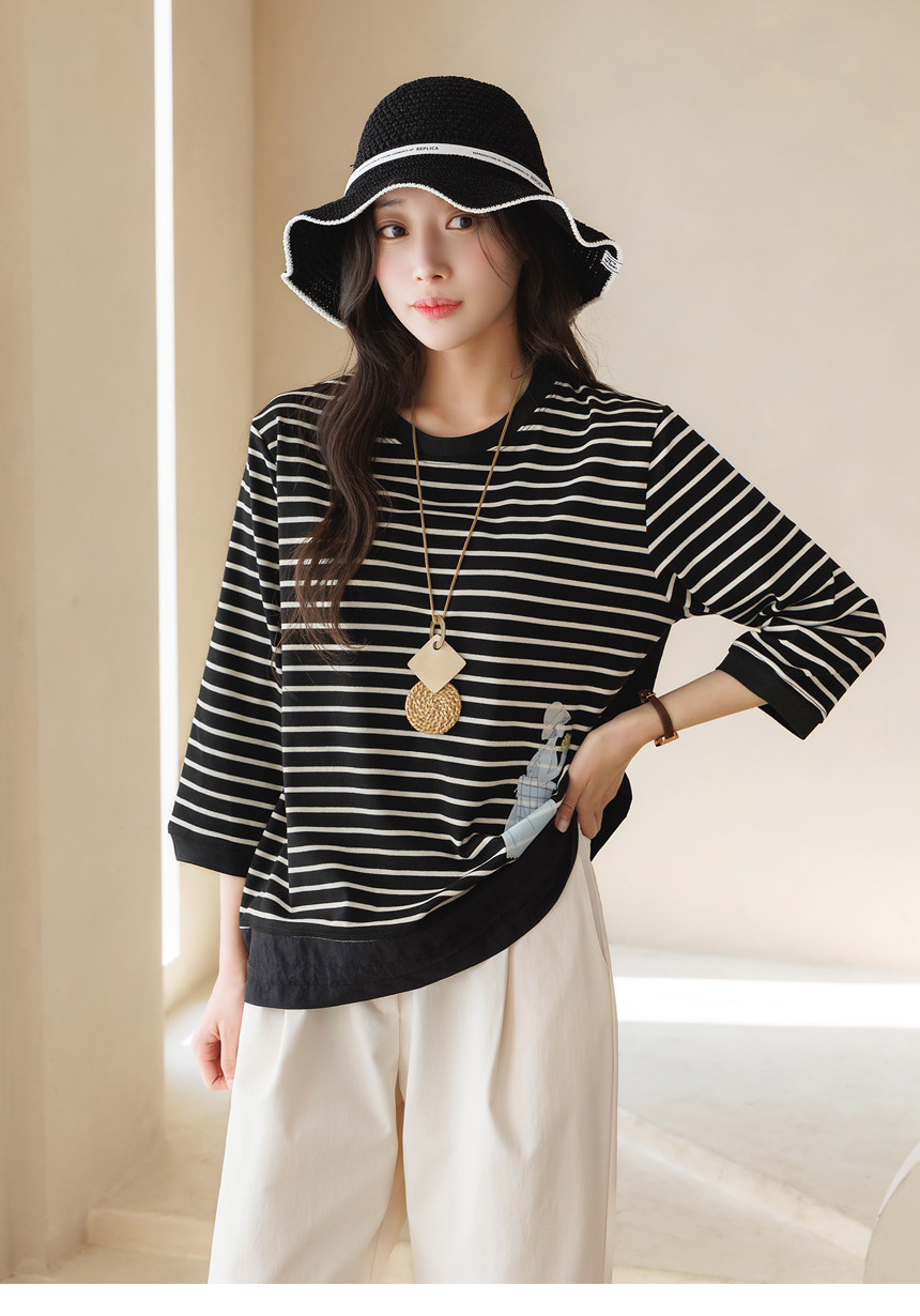 [Theonme] 헤이플 밑단 스트링 스프링걸 프린팅 스트라이프 배색 티셔츠