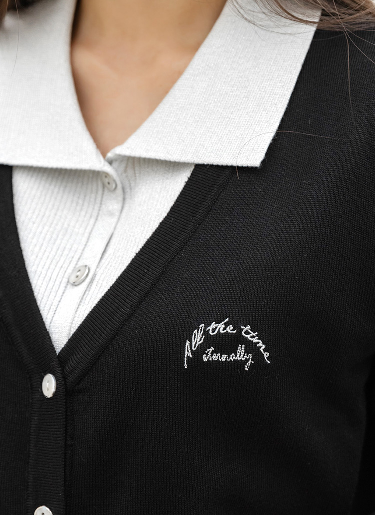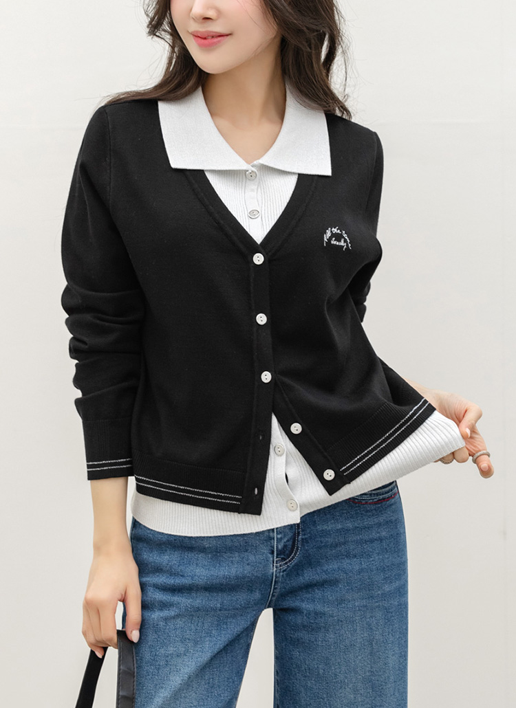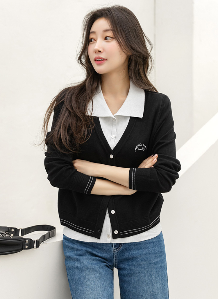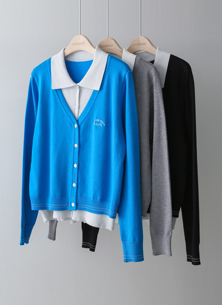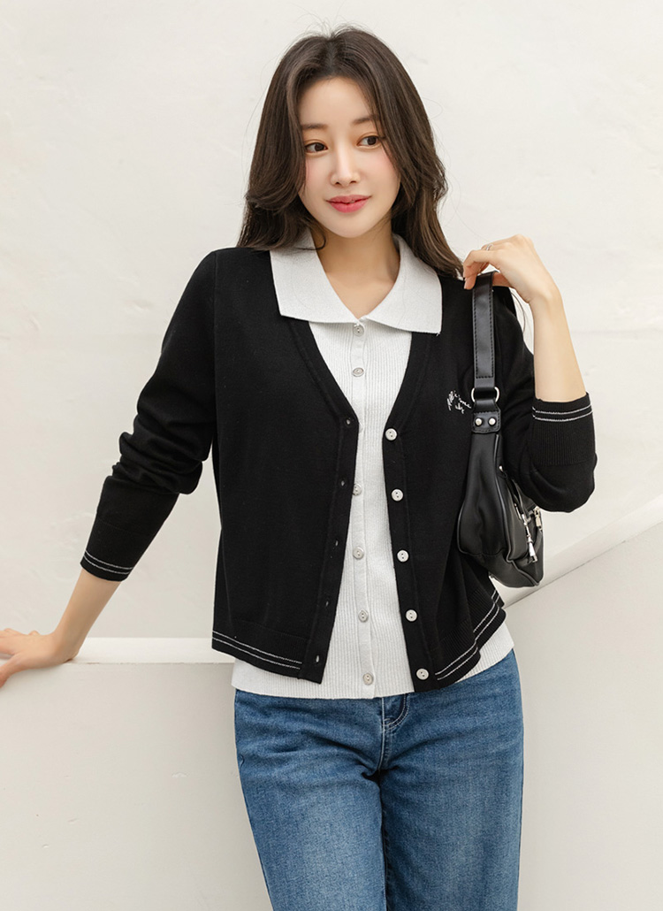 더블러 자수 포인트 이중 레이어드 배색 카라 니트 가디건