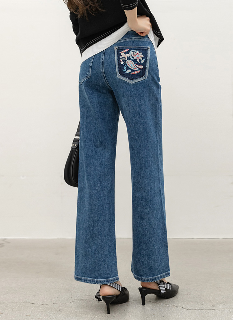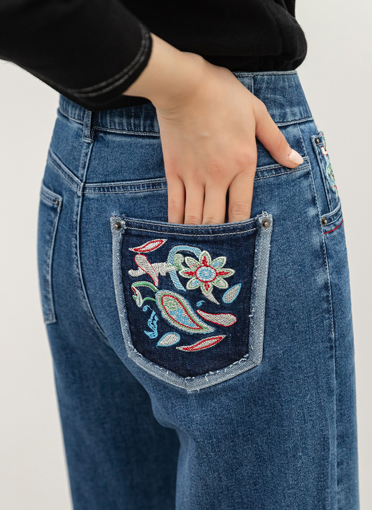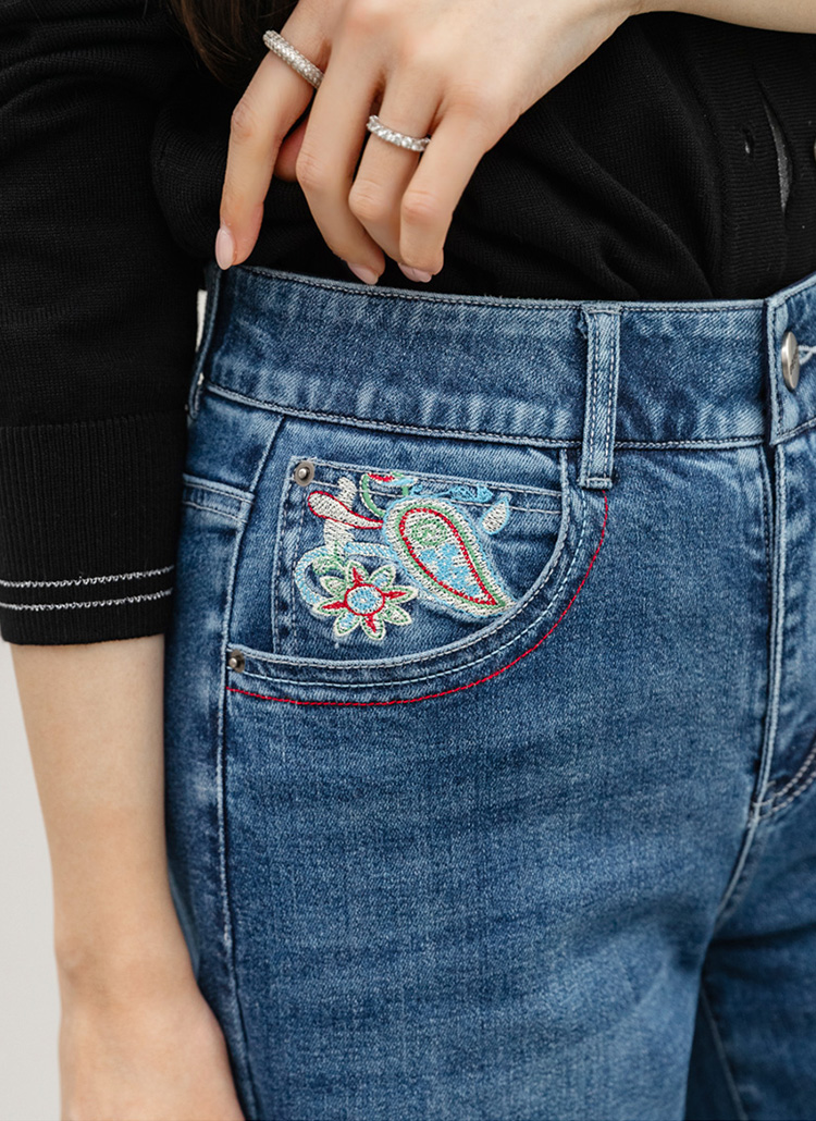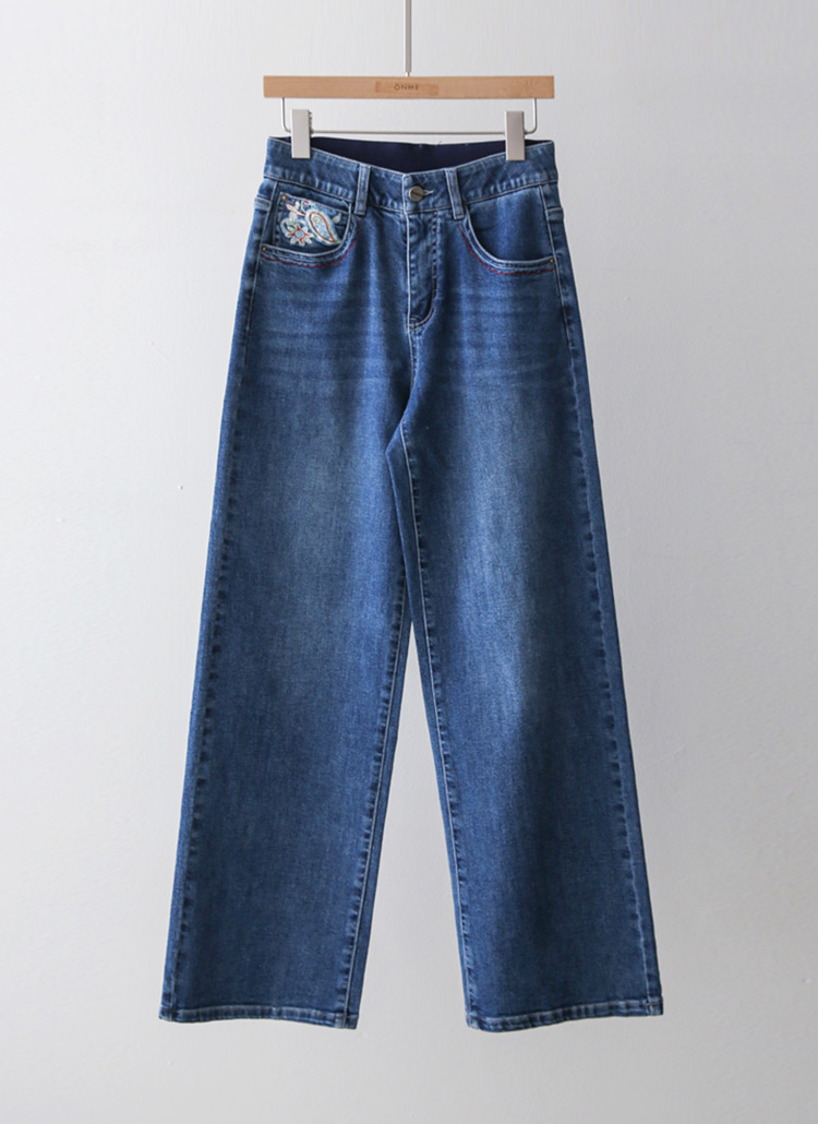 로어프 에스닉 페이즐리 자수 포인트 히든밴딩 세미 와이드 데님 팬츠