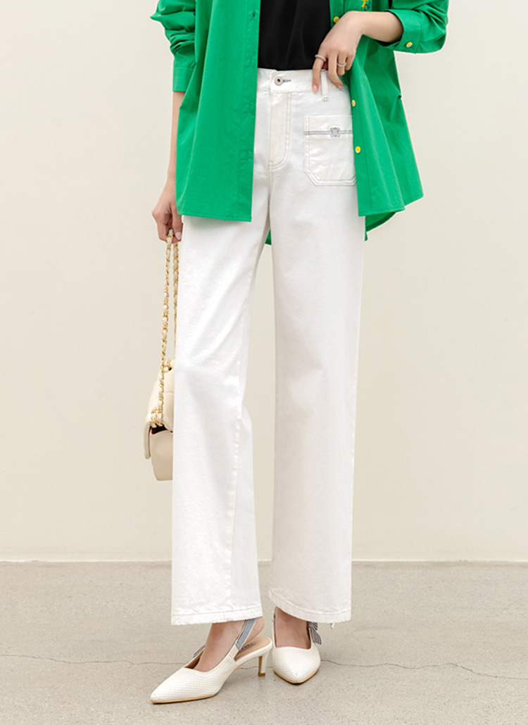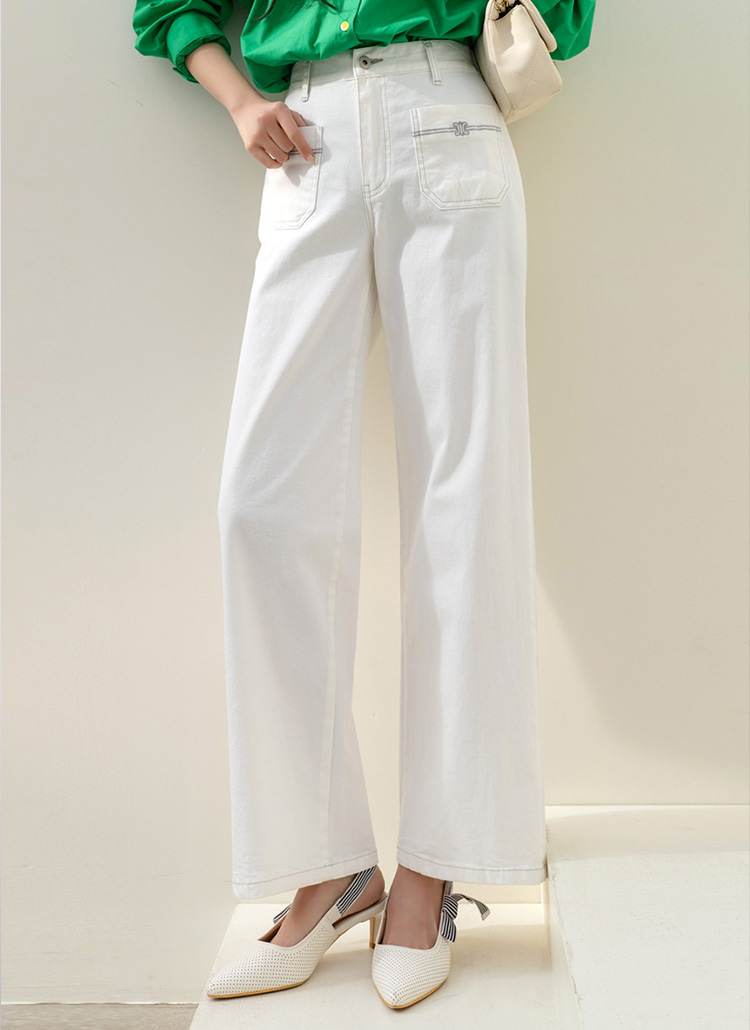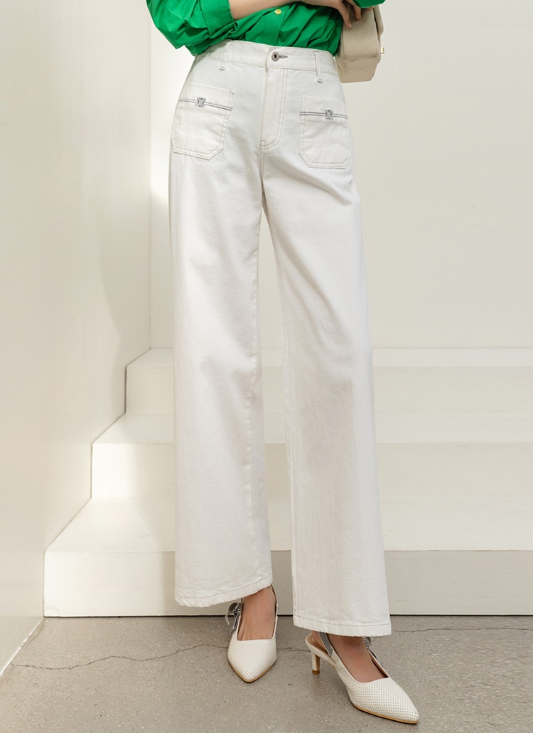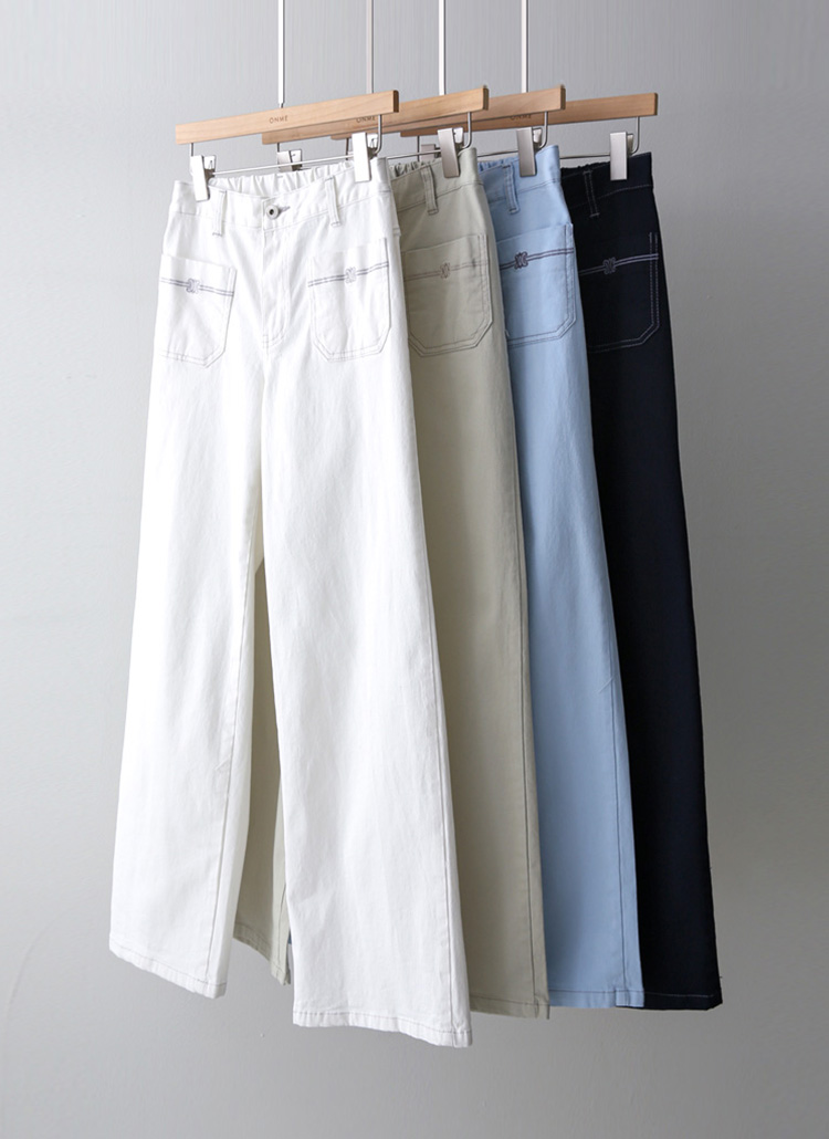 온디어 자수 포켓 백 밴딩 세미 와이드 일자 면 팬츠