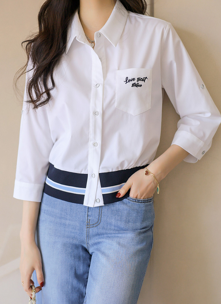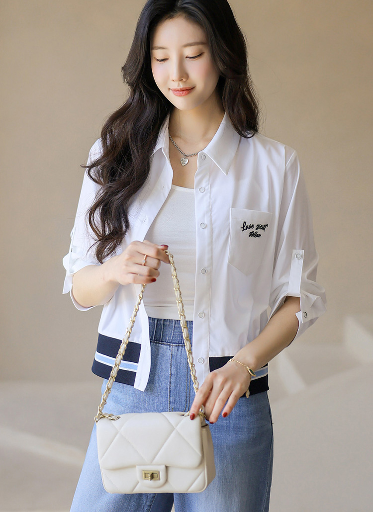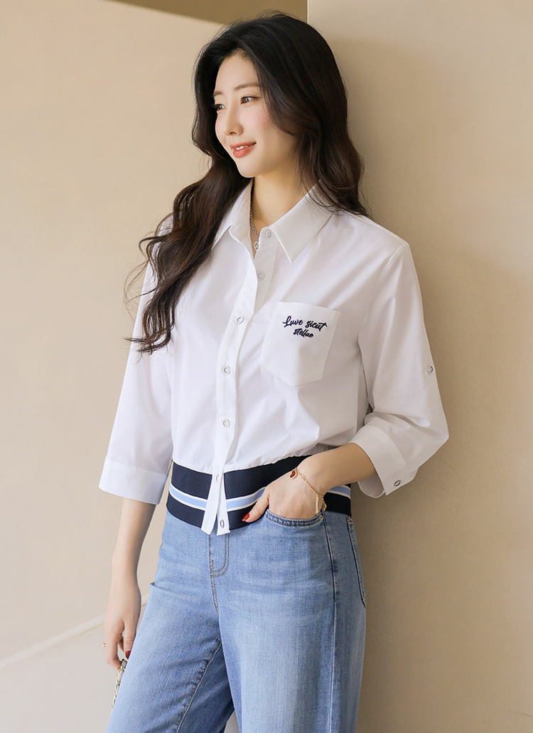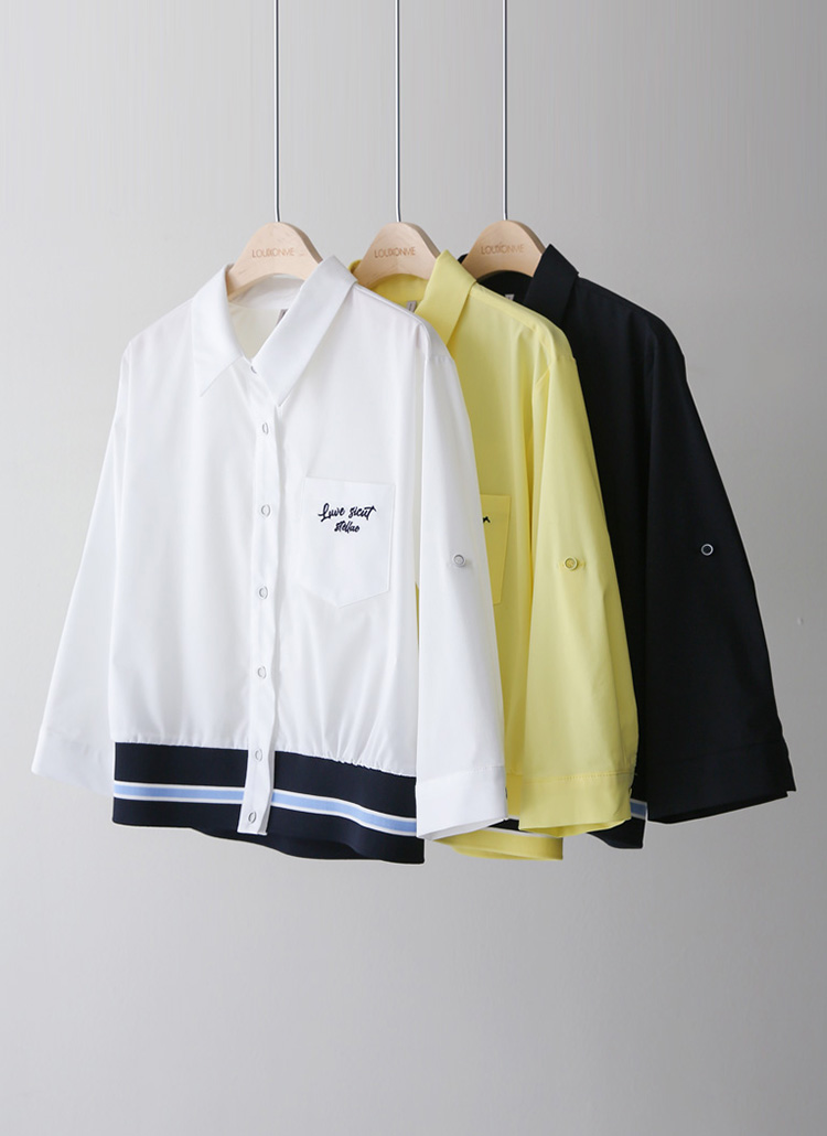 가볍게 걸쳐도 멋스러운 스타일을 완성해주는 밑단 밴딩 배색 롤업 셔츠예요