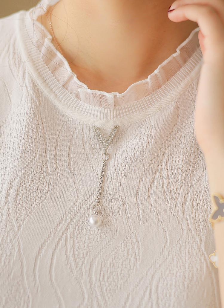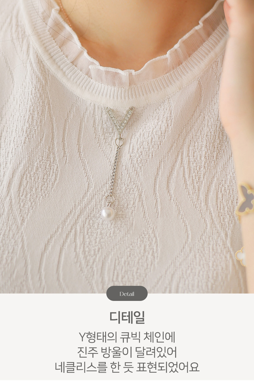 브이 형태의 큐빅 펜던트와 진주 체인 디테일이 더해져